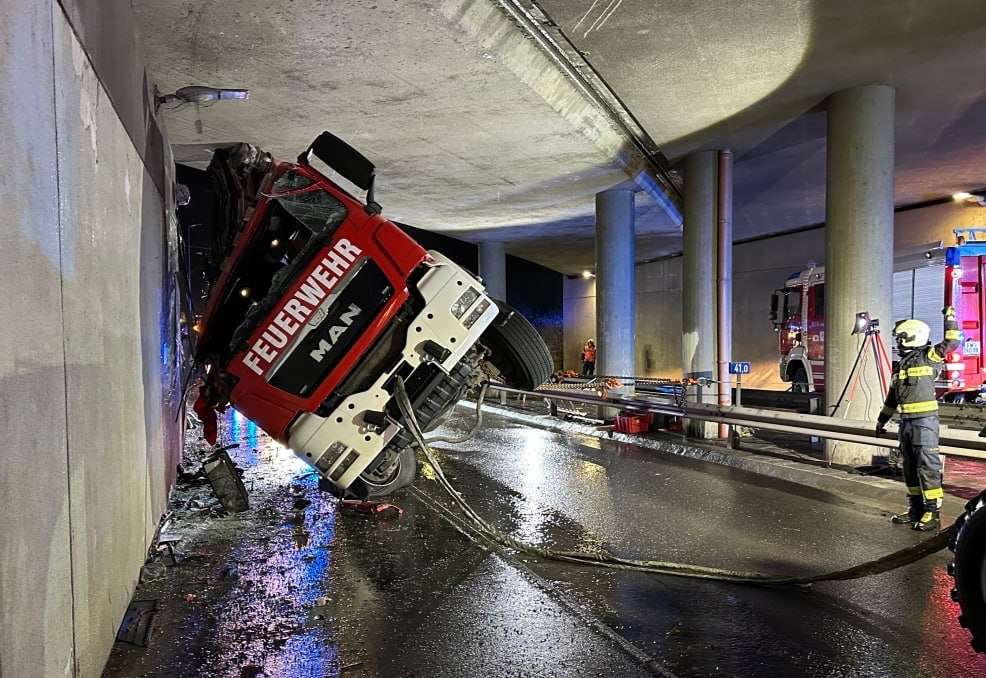 Auf dem Rückweg von einem Einsatz prallte das Wechselladerfahrzeug gegen eine Brückenstützmauer und kippte um. Der 32-jährige Lenker konnte nach Feuerwehrangaben selbstständig aussteigen, zwei Mitglieder mussten von ihren Kameraden aus dem Kfz befreit werden. Ein 24-Jähriger wurde laut Polizei ins Spital geflogen. Zwei Helfer erlitten leichte Blessuren, berichtete die Feuerwehr.