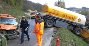 Auf der kurvigen Landesstraße waren Höhe Eggendorf (Bezirk Tulln) Donnerstag am frühen Nachmittag ein Tanklaster mit Anhänger und ein mit drei Personen besetzter Kleinbus des Straßenerhaltungsdienstes frontal gegeneinander geprallt.