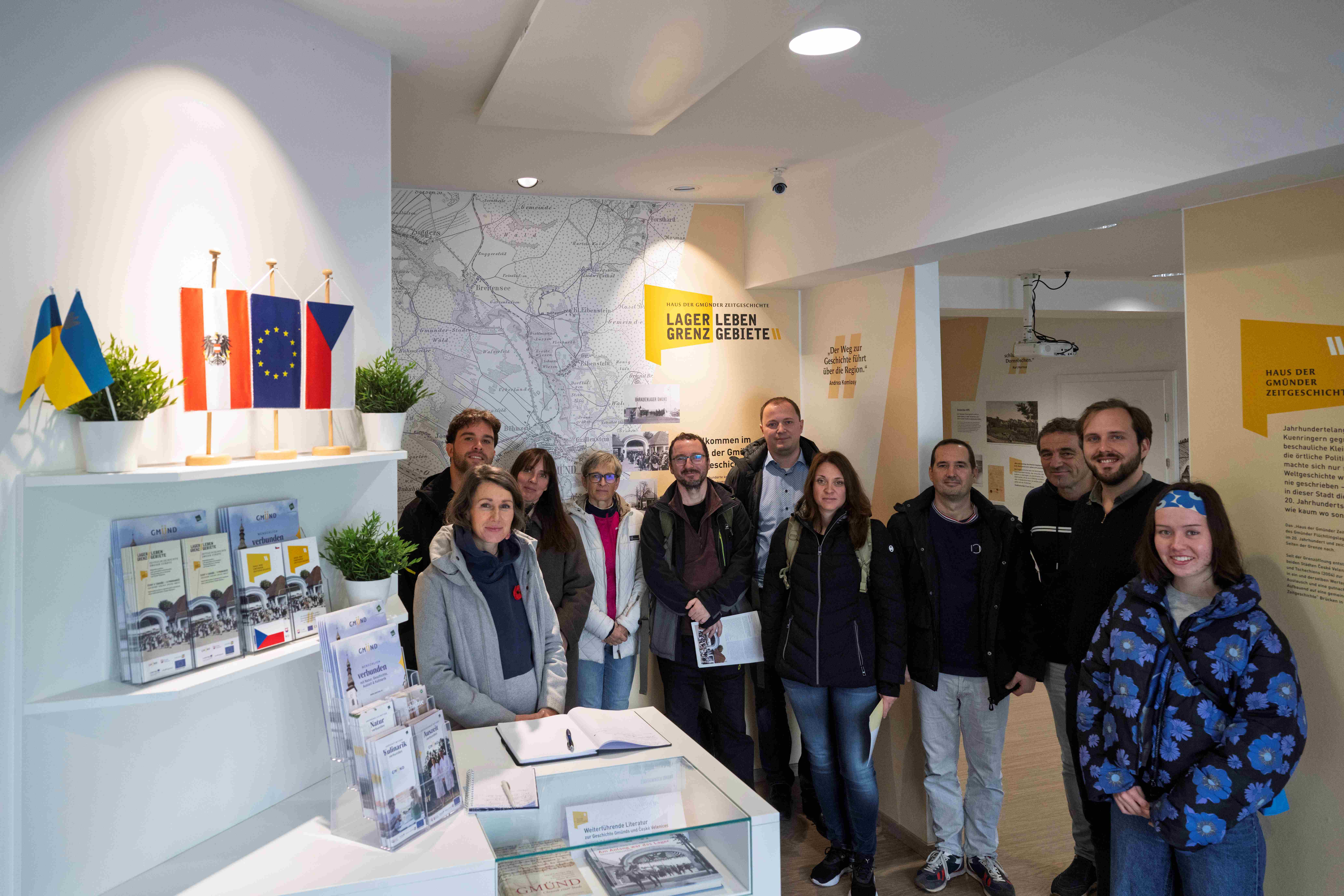 Beim ersten Historikertreffen des internationalen Forschungsteams in Gmünd standen u. a. eine Führung durch das Haus der Gmünder Zeitgeschichte, die Besichtigung ausgewählter Dokumente im Stadtarchiv sowie ein Besuch des Kafka-Denkmals beim ehemaligen Fußgängergrenzübergang Bleyleben und des historischen Bahnhofs in České Velenice auf dem Programm. Im anschließenden Workshop diskutierten die Teilnehmenden 40 verschiedene historische Ereignisse an der Grenze, die als Angelpunkte für eine facettenreiche Erzählung der Geschichte der Grenzregion dienen sollen. Vermittelt werden soll diese Geschichte auf einem beschilderten Radweg, der zwischen Wullowitz und Gmünd beiderseits der Grenze entlangführt, einem Reiseführer – in Online- und Printversion – sowie einem Bündel weiterer Vermittlungsaktivitäten.