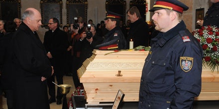 Der 26-Jährige sei "in Ausübung seiner Pflicht als Polizeibeamter" gestorben, war auf der Parte zu lesen. "Gute Menschen gleichen Sternen, sie leuchten noch lange nach dem Erlöschen", stand auf dem Erinnerungskärtchen. Der ganze Ort nahm Abschied - viele junge Menschen ebenso wie zahlreiche Polizeikollegen kondolierten der Familie des getöteten Beamten. Ein langer Zug von Trauergästen bildete sich bereits eine knappe Stunde vor Beginn des Trauergottesdienstes, nicht alle fanden in der Kirche Platz. Die Messe wurde per Lautsprecher ins Freie übertragen.