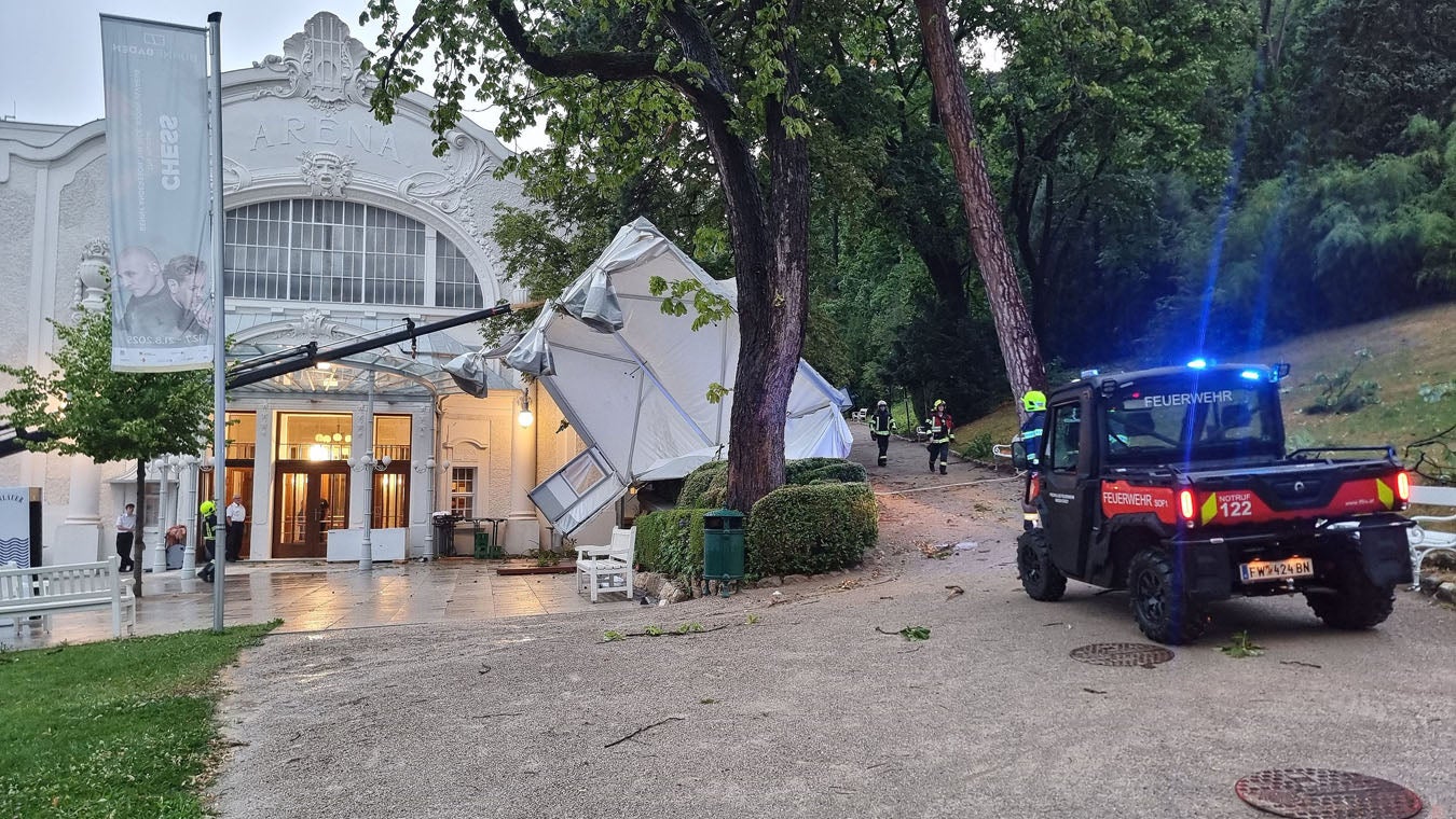 Stark betroffen war Baden. Dort wurde der Kurpark gesperrt, nachdem Bäume umgeknickt waren. Einige Passanten zeigten sich laut Bezirksfeuerwehrkommando uneinsichtig und entfernten Absperrungen. Auf dem Areal der Sommerarena im Badener Zentrum wurde Sonntagabend ein Gastrozelt weggeschleudert, Verletzte gab es nicht.