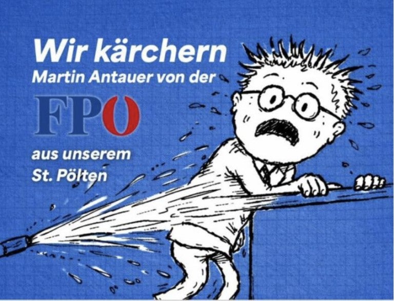Darauf tauchte- wohl von der „SPÖ Community Basis“ initiiert - in den sozialen Medien ein geschmackloses Bild auf, darauf ist zu lesen: "Wir kärchern Martin Antauer von der FPÖ aus unserem St. Pölten." Auf dem Sujet ist eine Karikatur des FPÖ-Manns zu sehen der gerade mit Wasser angestrahlt wird.