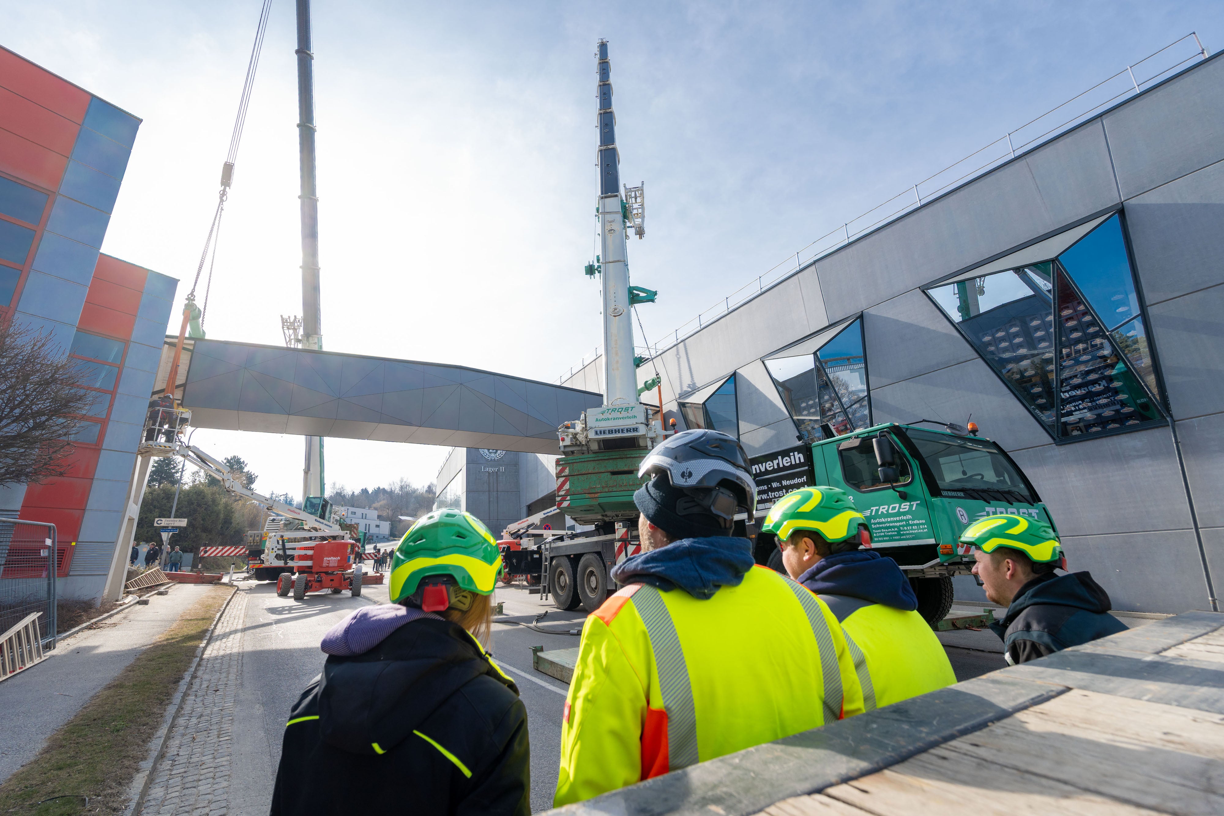 Im Vorfeld wurde die Rohrbrücke in der Brauerei mit den notwendigen Leitungen und Kabeln vorbestückt und mit einer Außenverkleidung versehen. Am Samstag frühmorgens wurde die 33 Tonnen schwere Konstruktion aus der Halle transportiert und mit zwei Schwerlastkränen auf die vorbereiteten Säulen gehoben. Anschließend dockt die Brücke an den Gebäudeteilen beiderseits der Ottenschläger Straße an – ähnlich einem Flugzeug, das an ein Gate angeschlossen wird. Für diese Montagearbeiten wurde die Straße für den Verkehr gesperrt.