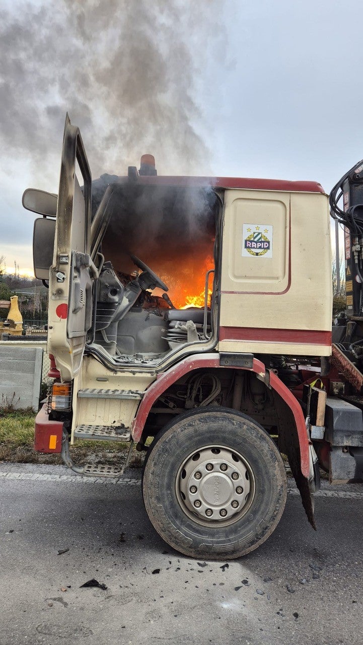 Nach unzähligen gescheiterten Versuchen "erbarmte" sich ihm schließlich ein Müllwagenfahrer. Mithilfe des Kollegen unternahm der Gemeindemitarbeiter, der übrigens Mitglied der Freiwilligen Feuerwehr ist, erste Löschversuche. Trotz des mutigen Engagements der beiden Männer war die Fahrerkabine des Lkws beim Eintreffen der Feuerwehr Ebreichsdorf bereits in Vollbrand, wie Einsatzleiter Michael Ditzer berichtet. Unbeschadet blieb lediglich der Aufkleber des SK Rapid neben der Fahrertüre. Um den Lastwagen zu bergen, musste die B16 zwischen Ebreichsdorf und dem Kreisverkehr der Magna Racino vorübergehend komplett gesperrt werden. Als Ursache für den Brand steht aktuell ein technischer Defekt im Raum.
