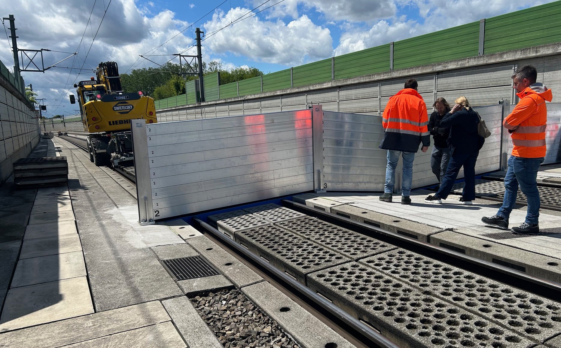 Auf dem Programm standen eine Baustellenbegehung im Atzenbrugger Tunnel inklusive Aufbau des mobilen Hochwasserschutzes beim Tunnelportal Ostseite. Die letzten Elemente wurden gemeinsam mit der Freiwilligen Feuerwehr eingesetzt. Das Schutzwerk ist eineinhalb Meter hoch und kann binnen zwei Stunden aufgebaut werden. Vom Osten sei das Wasser im vergangenen Herbst buchstäblich in den Atzenbrugger Tunnel "geschossen", erläuterte David Scheiblauer von den ÖBB.