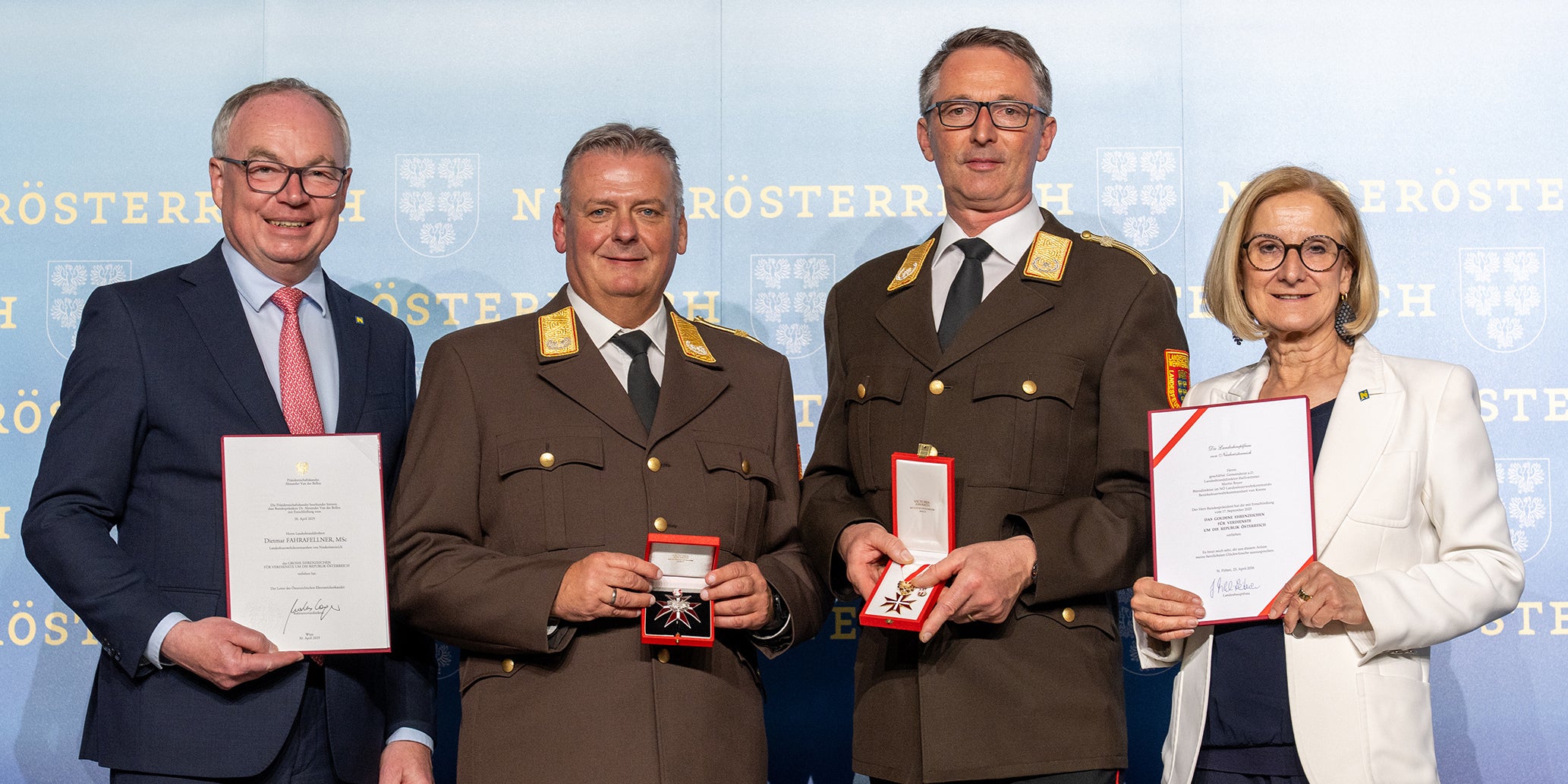 Besondere Auszeichnungen gab es für die Feuerwehr-Chefs: Landesfeuerwehrkommandant Dietmar Fahrafellner erhielt das Große Goldene Ehrenzeichen der Republik, sein Stellvertreter Martin Boyer das Goldene Ehrenzeichen.