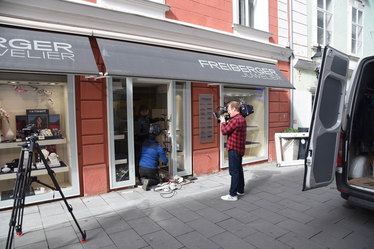 Im Inneren dürfte innerhalb kürzester Zeit Beute gemacht worden sein, erzählt der geschockte Junior-Chef Thomas Freiberger: "Mein Vater wurde von der Handy-APP alarmiert und musste dem minutenschnellen Einbruch tatenlos zuschauen. Die brauchten genau 1 Minute und 40 Sekunden, rafften Schmuck und Uhren an sich und konnten damit flüchten." Draußen soll ein Aufpasser gestanden sein. Schreie das Vaters, der über dem Laden wohnt, juckte die vermummten Täter keineswegs.