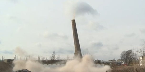 Um Punkt 12.00 Uhr fiel das Bauwerk nach einem kurzen Knall um. Spezialisten der Sprenggruppe der Feuerwehr hatten dafür 50 Bohrlöcher in die 1,5 Meter dicke Ziegelwand des Rauchfangs gebohrt und 15 Kilogramm Sprengstoff eingebracht.