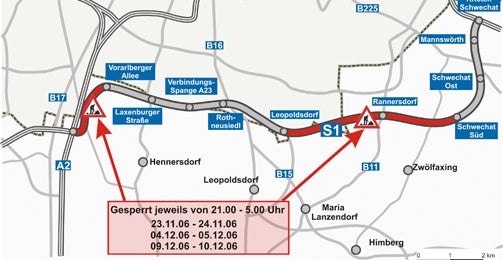 Jeweils ab 21.00 Uhr bis 5.00 Uhr früh in Fahrtrichtung Schwechat zwischen dem Knoten Vösendorf und der Anschlussstelle Vorarlberger Allee sowie zwischen den Anschlussstellen Leopoldsdorf und Schwechat/Süd.