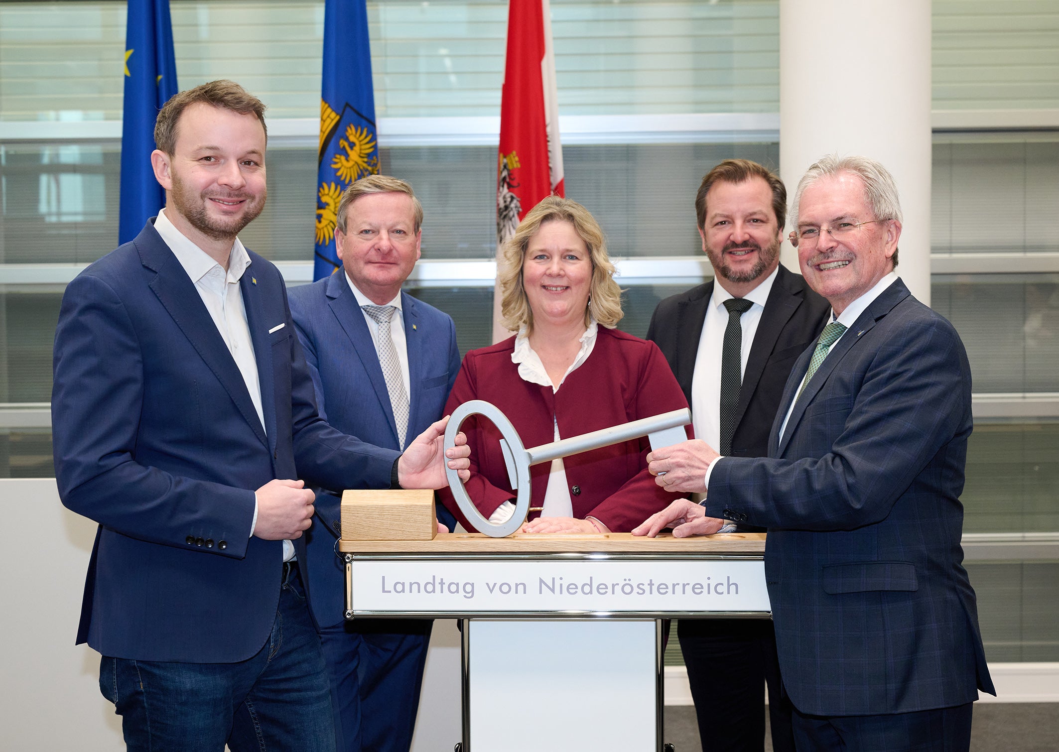 Mit einer symbolischen Schlüsselübergabe haben Landtagspräsident Karl Wilfing (ÖVP) und seine beiden Stellvertreter Zweiter Präsident Gottfried Waldhäusl (FPÖ) und Dritte Präsidentin Elvira Schmidt (SPÖ) sowie Landtagsdirektor Thomas Obernosterer von Abteilungsleiter Christoph Reiter (LAD3 - Gebäude- und Liegenschaftsmanagement) das Ausweichquartier des Landtages übernommen.