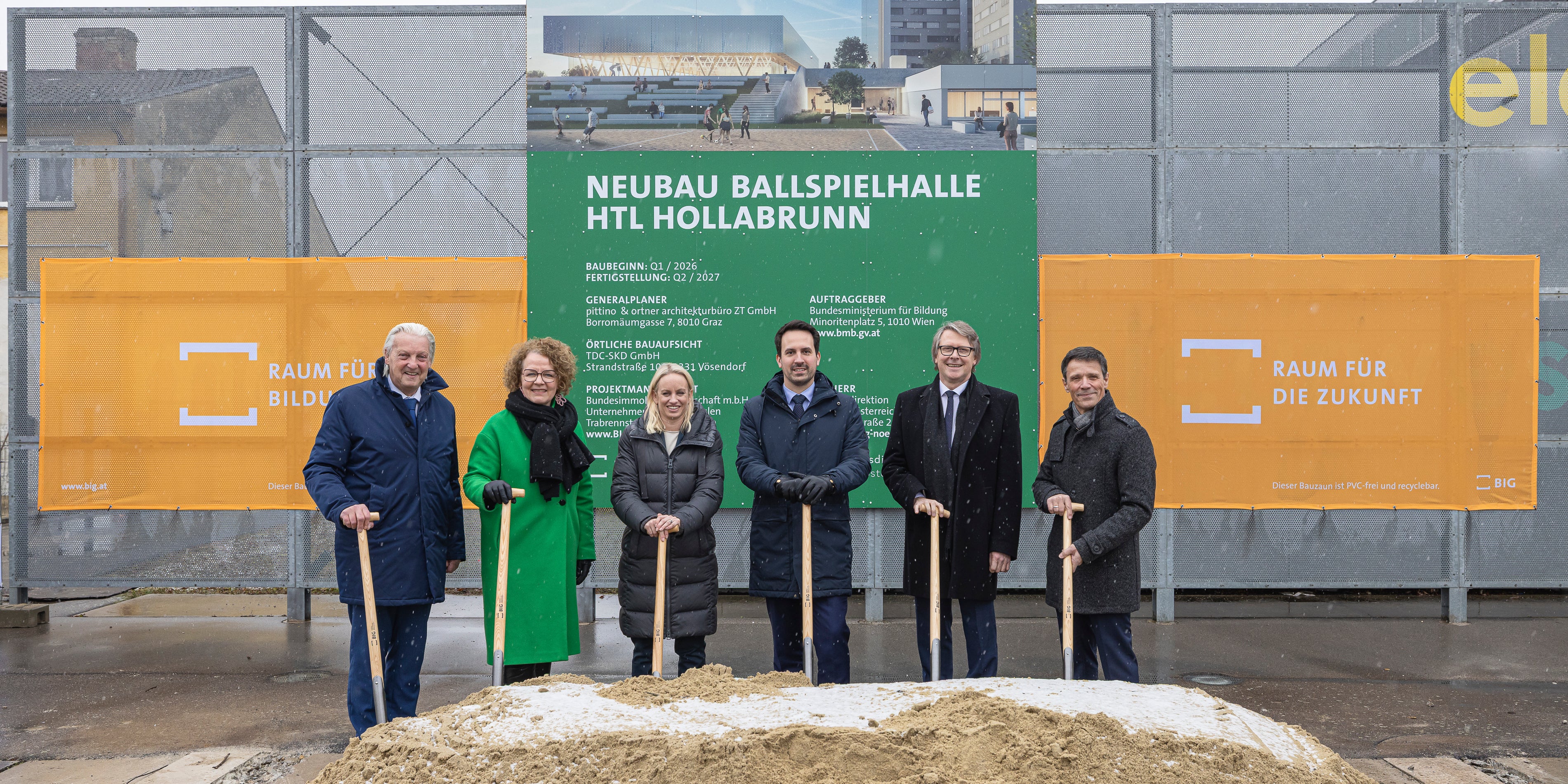 Die Bundesimmobiliengesellschaft errichtet im Auftrag des Bundesministeriums für Bildung und für die Bildungsdirektion NÖ eine neue Ballspielhalle für die HTL Hollabrunn. Heute Vormittag setzte man den feierlichen Spatenstich zu dem Bauprojekt.