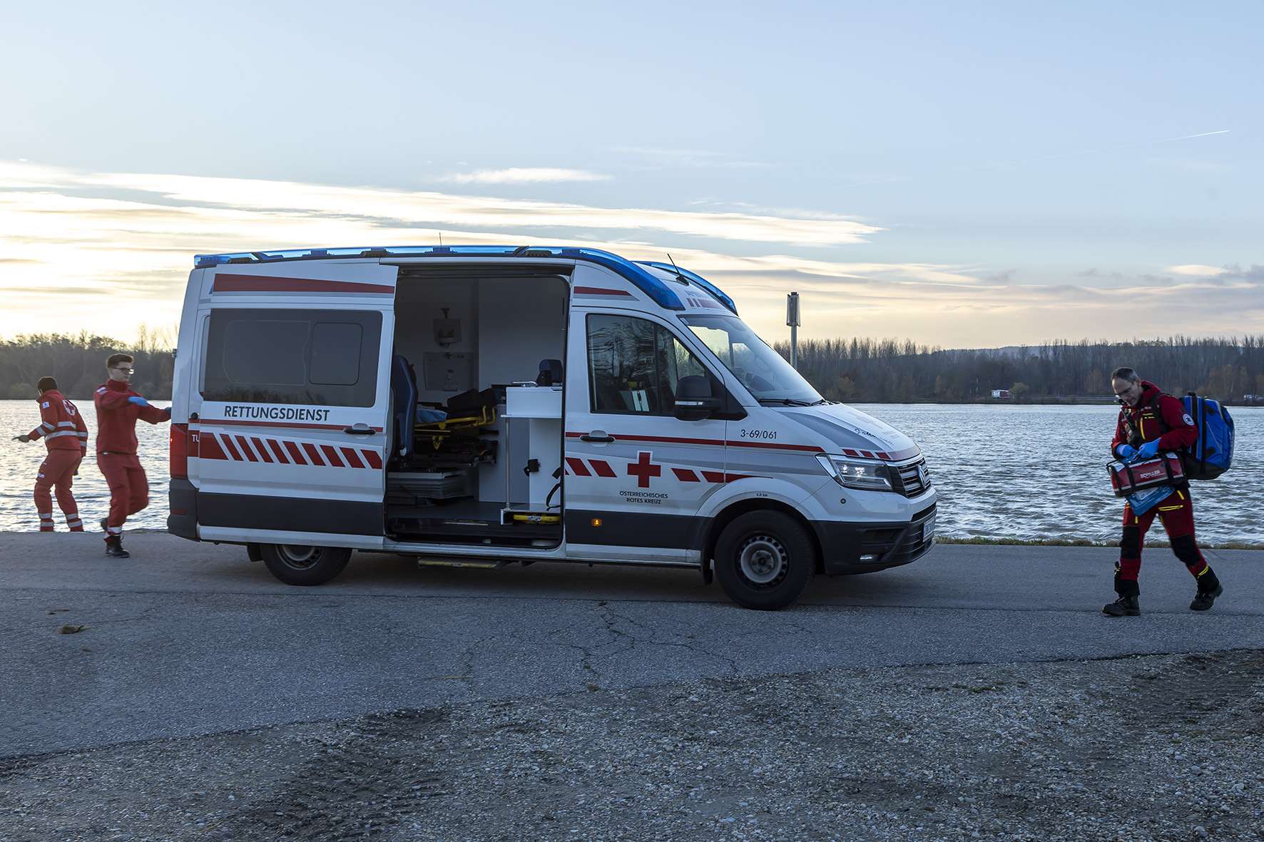 Noch bevor diese vor Ort waren, zogen der Zeuge und ein Lkw-Fahrer, der die Szene beobachtet hatte, die Frau zusammen aus dem Wasser. Rettungskräfte übernahmen die unterkühlte Dame und begannen mit der Erstversorgung.