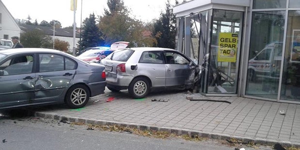 Nach der Kollision mit einem anderen Auto an einer Kreuzung der LH17 in Velm-Götzendorf (Bezirk Gänserndorf) ist ein 58-jähriger Pkw-Lenker am Donnerstagnachmittag mit seinem Fahrzeug ins das Foyer eine Bank geschleudert worden. Der Mann wurde bei dem Zusammenstoß verletzt und musste ins Landesklinikum Mistelbach eingeliefert werden, teilte die Polizei in einer Aussendung mit.