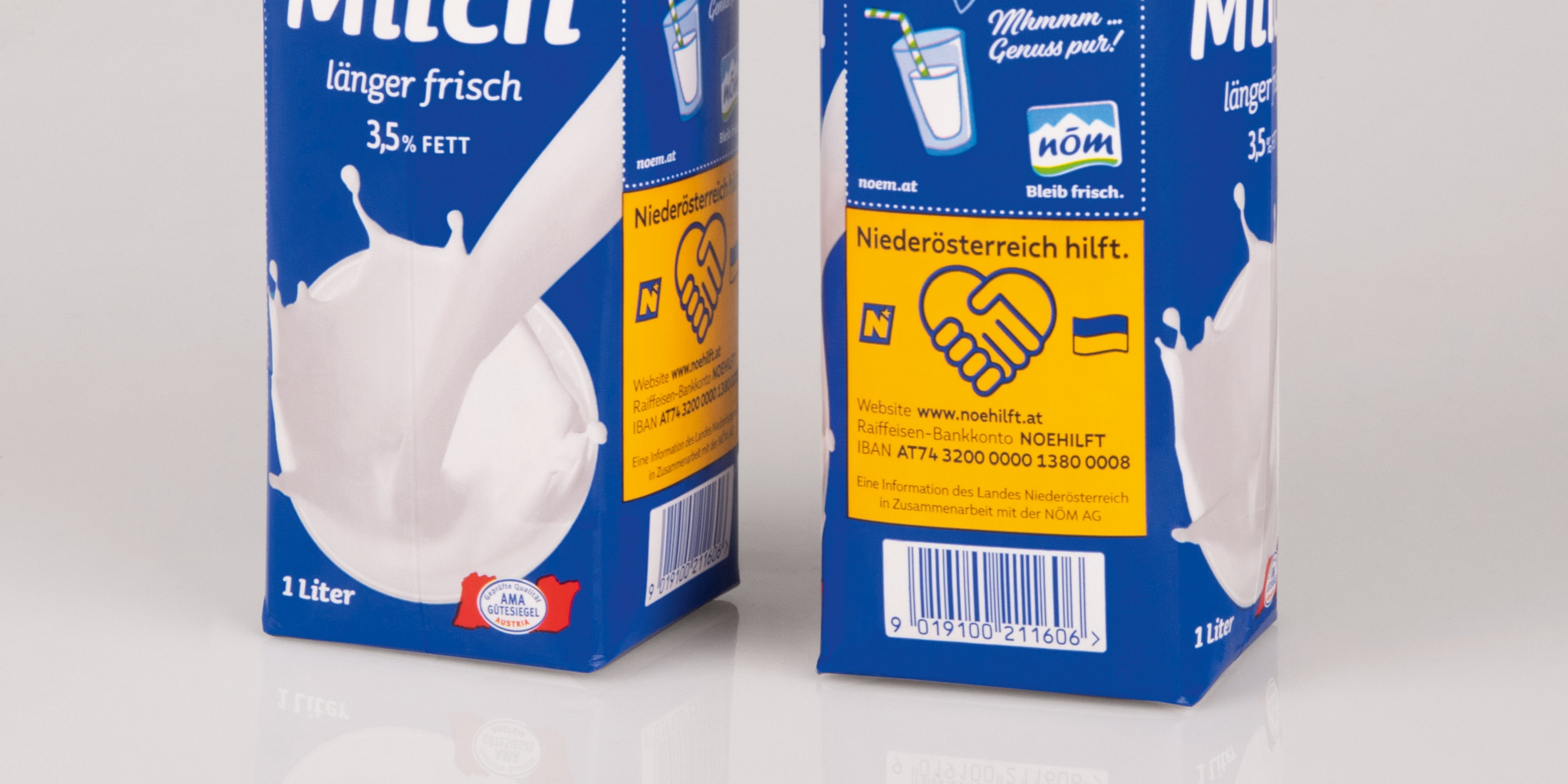 NÖM stellt der Initiative "Niederösterreich hilft." über die NÖM-1-Liter-Vollmilchpackung eine Fläche zum Spendenaufruf zur Verfügung, denn eine NÖM-Milchpackung erreiche so großflächig den Osten Österreichs, heißt es in der Aussendung weiter.