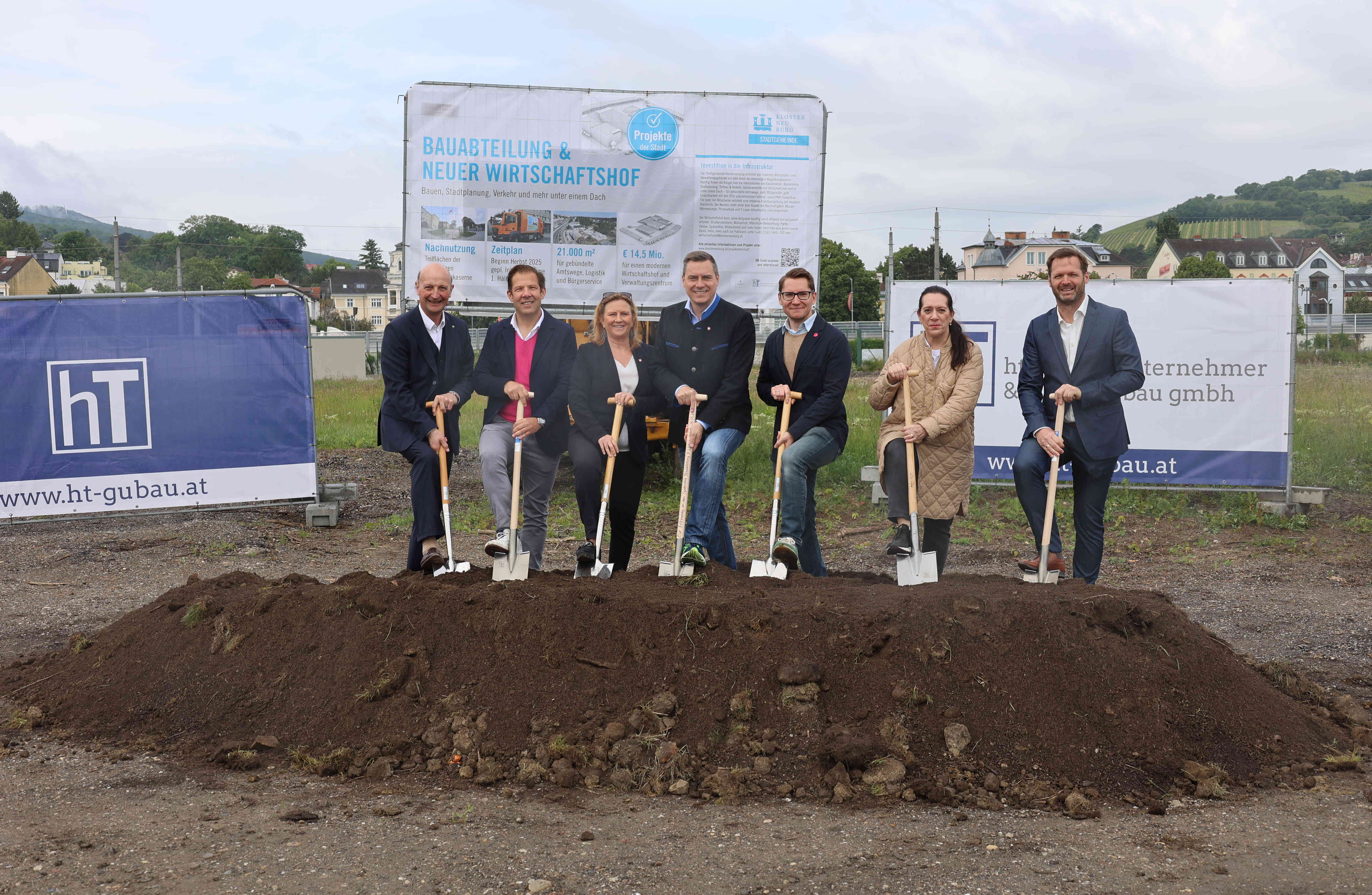 Am Montag versammelten sich Vertreterinnen und Vertreter der Stadtpolitik, der Planer und der Baufirma auf dem Gelände der ehemaligen Magdeburgkaserne. Bürgermeister Christoph Kaufmann (ÖVP), Vizebürgermeisterin Maria T. Eder (ÖVP), Stadtrat Clemens Ableidinger (Neos) und Stadträtin Jacqueline Eschlböck (Grüne) griffen gemeinsam zum Spaten. Im Herbst beginnen die Bauarbeiten für den Neubau des neuen Wirtschaftshofes samt Verwaltungsgebäude. Die Inbetriebnahme ist für die erste Jahreshälfte 2027 vorgesehen. Die Stadt Klosterneuburg investiert rund 14,5 Millionen Euro in das Projekt. Mit der Umsetzung wurde die Firma „hT Generalunternehmer & Industriebau“ beauftragt.