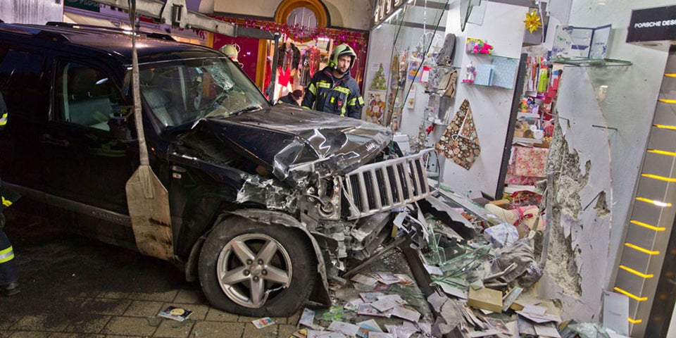 Das Auto wurde bei dem Unfall stark beschädigt, Motoröl lief aus. Vor und in der Papier- und Bürowarenhandlung lagen Trümmerteile und Glassplitter.