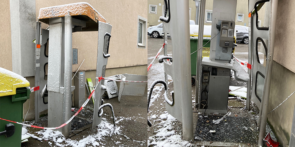 In Amstetten ist am Samstag in den frühen Morgenstunden eine Telefonzelle gesprengt worden. Unbekannte hatten kurz vor 4.30 Uhr in der Krautbergstraße einen Böller gezündet. Durch die Detonation wurde die Telefonzelle fast völlig zerstört, Teile wurden bis zu 15 Meter weit weggeschleudert. Auch ein Pkw und die Kabel-TV-Anschluss-Abdeckung eines Hauses wurden beschädigt. Hinweise werden laut Aussendung von Sonntag an die Polizeiinspektion Amstetten (Tel. 059-133-3100) erbeten.