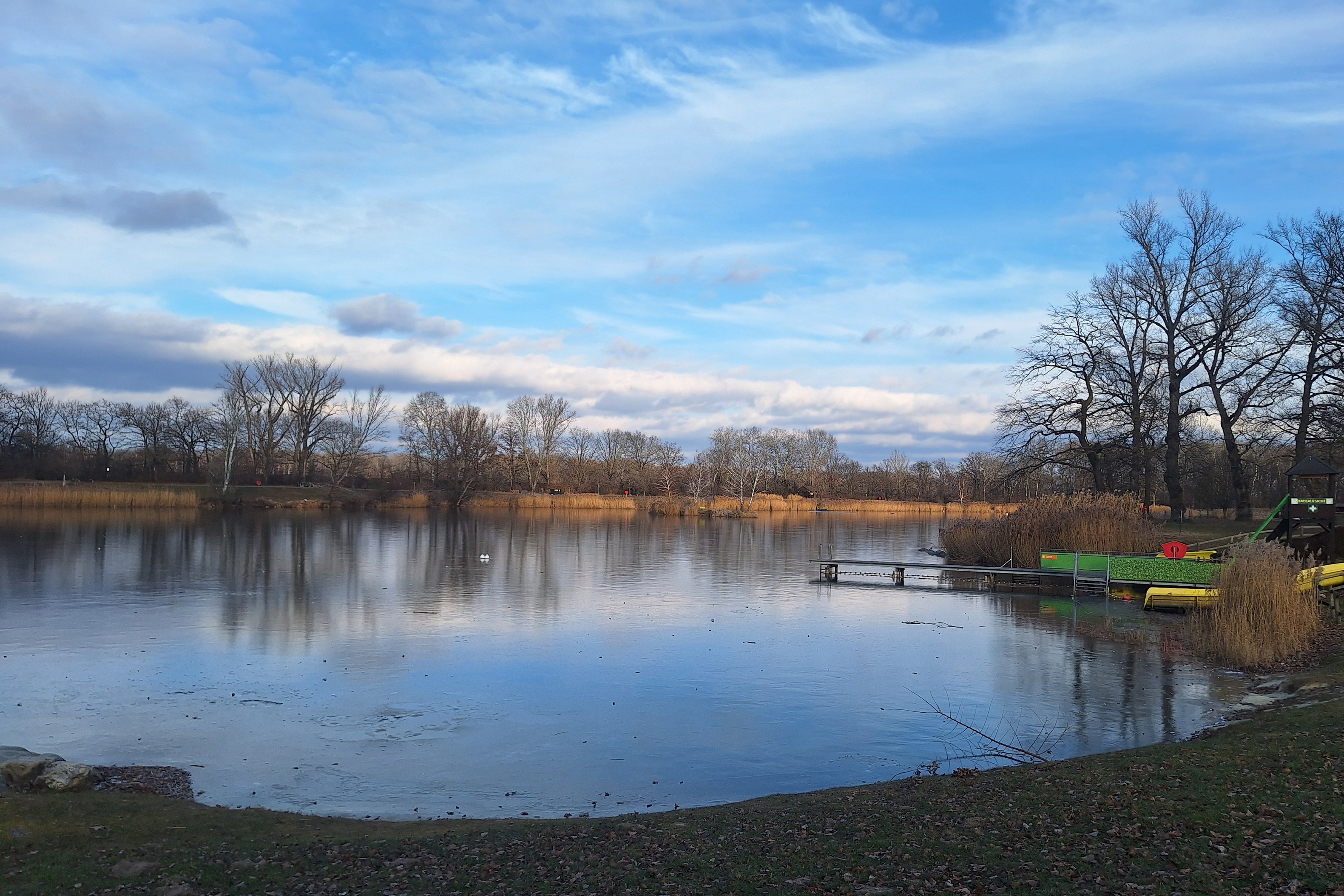 unerschrockene Eisbadende. Derzeit hat sich aufgrund tatsächlich winterlicher Temperaturen sogar eine Eisschicht auf der Wasserfläche gebildet. Eislaufen ist hier aber aus Sicherheitsgründen (Einbruchgefahr!) streng verboten – ein Verbot das übrigens auch für alle anderen öffentlichen Wasserflächen (wie z.B. Wasserpark Tulln sowie Dorflacke und Badwasser in Langenlebarn) gilt. Außerdem wird das Gelände gerade auf die nächste Frühjahrs- bzw. Sommersaison vorbereitet.