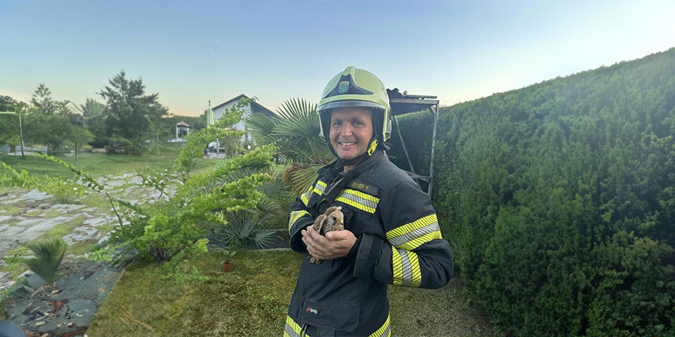 Ein Mitglied der Freiwilligen Feuerwehr des Ortes stieg daraufhin mit einer Leiter zur Baumkrone hinauf. Er befreite den Falken, der in seinem Nest festhing, wie die Feuerwehr am Sonntag mitteilte.