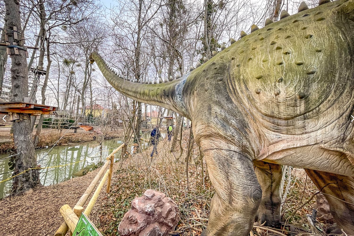 Der Riesensaurier ist wahrlich nichts für schwache Nerven oder kleine Vorgärten. Mit einer stolzen Länge von 19 und einer Höhe von sieben Metern braucht der Hausherr ordentlich Platz auf dem Grundstück. Damit das gewaltige Trumm auch bei Wind und Wetter fest am Boden bleibt, ruht der Körper aus robustem Kautschuk auf einem massiven Untergestell aus Stahl. Insgesamt bringt der Dino stolze 1.700 Kilogramm auf die Waage.