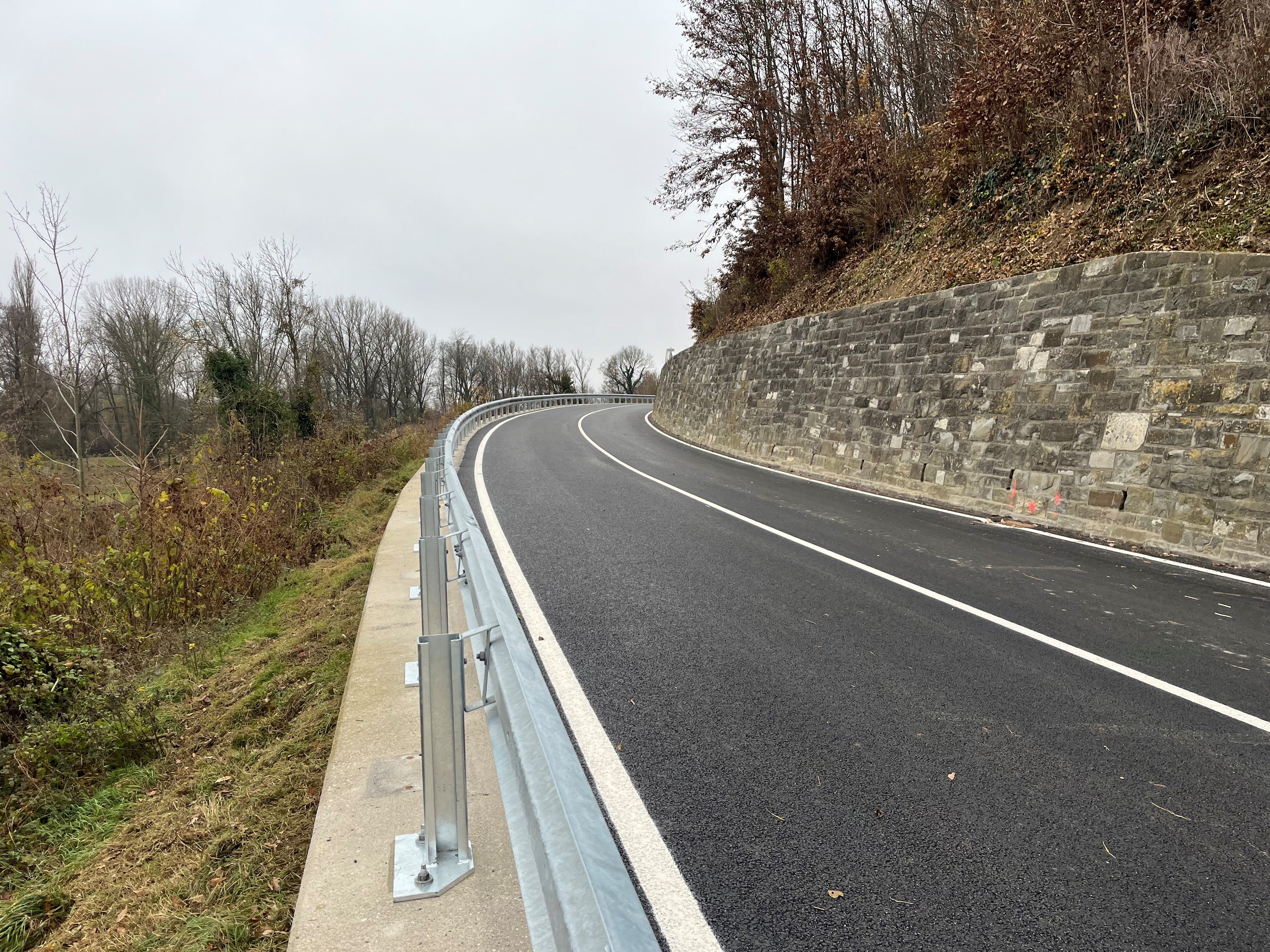 Um die Straße dauerhaft und sicher wiederherzustellen, waren umfassende geotechnische Maßnahmen notwendig. Auf einer Fläche von rund 3.200 m² wurde eine Felsvernetzung errichtet, die mit 358 verpressten Pfählen im Untergrund verankert ist. Eine geschlossene Bohrpfahlwand mit 366 Pfählen – davon 185 Großbohrpfähle bis zu 18 m Tiefe und 181 Drainagepfähle bis zu 6 m Tiefe – sichert nun den Straßenkörper auf einer Länge von etwa 600 Metern. Anschließend erfolgten der Neubau der Fahrbahn, das Setzen von Leitschienen, das Aufbringen der Bodenmarkierungen sowie die Humusierung der Böschungen. Die Gesamtkosten der Sanierung betragen rund 4,1 Millionen Euro und werden zur Gänze vom Land Niederösterreich getragen.