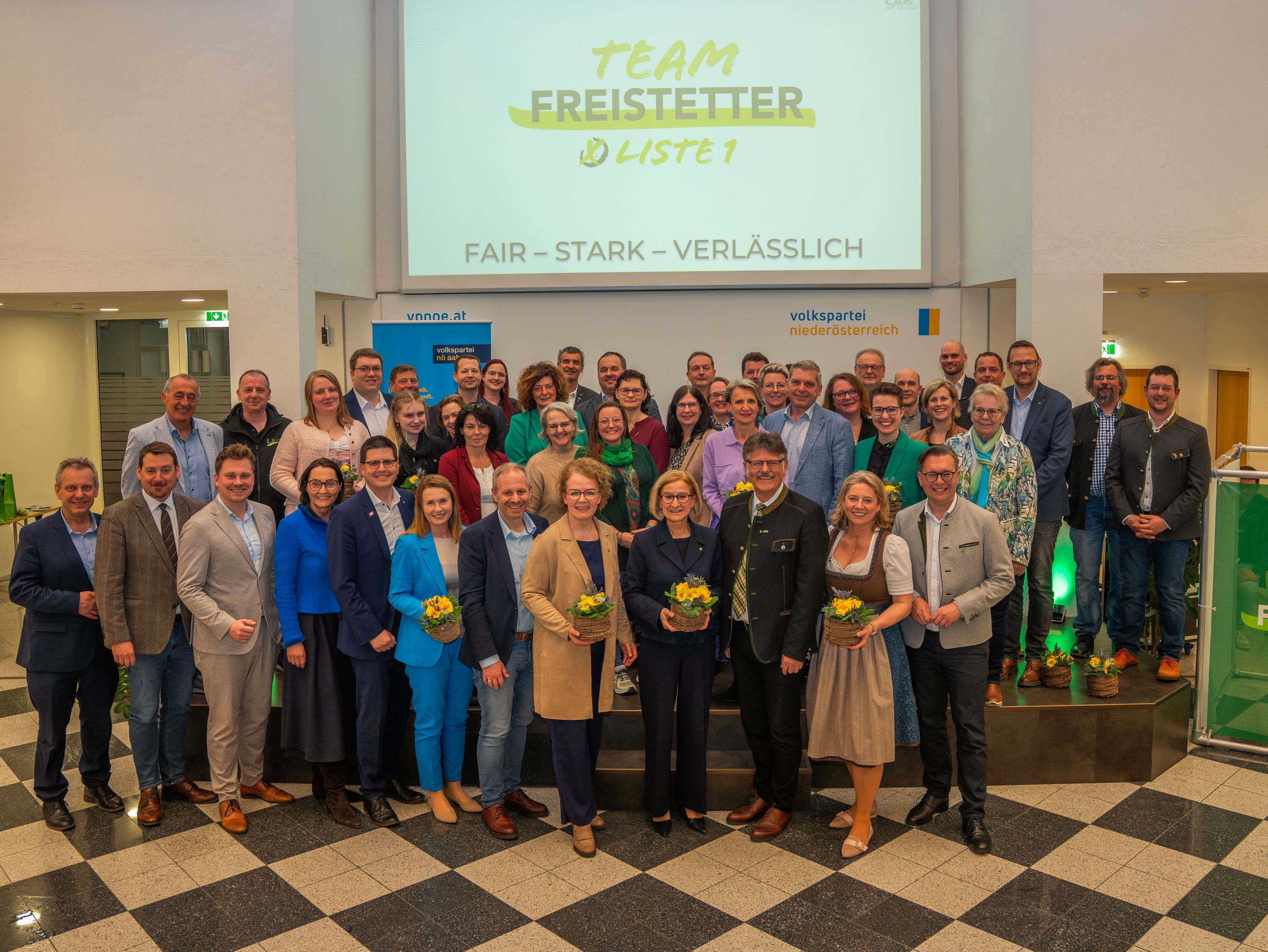An der Spitze des gestrigen Wahlkampfautakts standen Landeshauptfrau Johanna Mikl-Leitner, NÖAAB-Landesobfrau Christiane Teschl-Hofmeister, FCG NÖ-Vorsitzender Matthias Deiser, FCG-Bundesvorsitzende NR Romana Deckenbacher, Generalsekretär der Österreichischen Landarbeiterkammer Fabian Schaup, Amtsdirektorin der NÖ Landarbeiterkammer Bianca Pörner, Vizepräsident der NÖ Landwirtschaftskammer Lorenz Mayr, Vorsitzender der Landespersonalvertretung Johann Zöhling, Landtagsabgeordneter Florian Krumböck, Bundesvorsitzende Stv. der FCG-Jugend Caro Grömer, AK-Fraktionsvorsitzender Josef Hager, NÖAAB-Landesgeschäftsführerin Katja Seitner, Landesgeschäftsführer der NÖ Senioren Hans Sommer, VPNÖ-Landesgeschäftsführer Matthias Zauner und die Spitzenkandidaten LAK-Präsident Andreas Freistetter und LAK-Vizepräsidentin Judith Hartl.