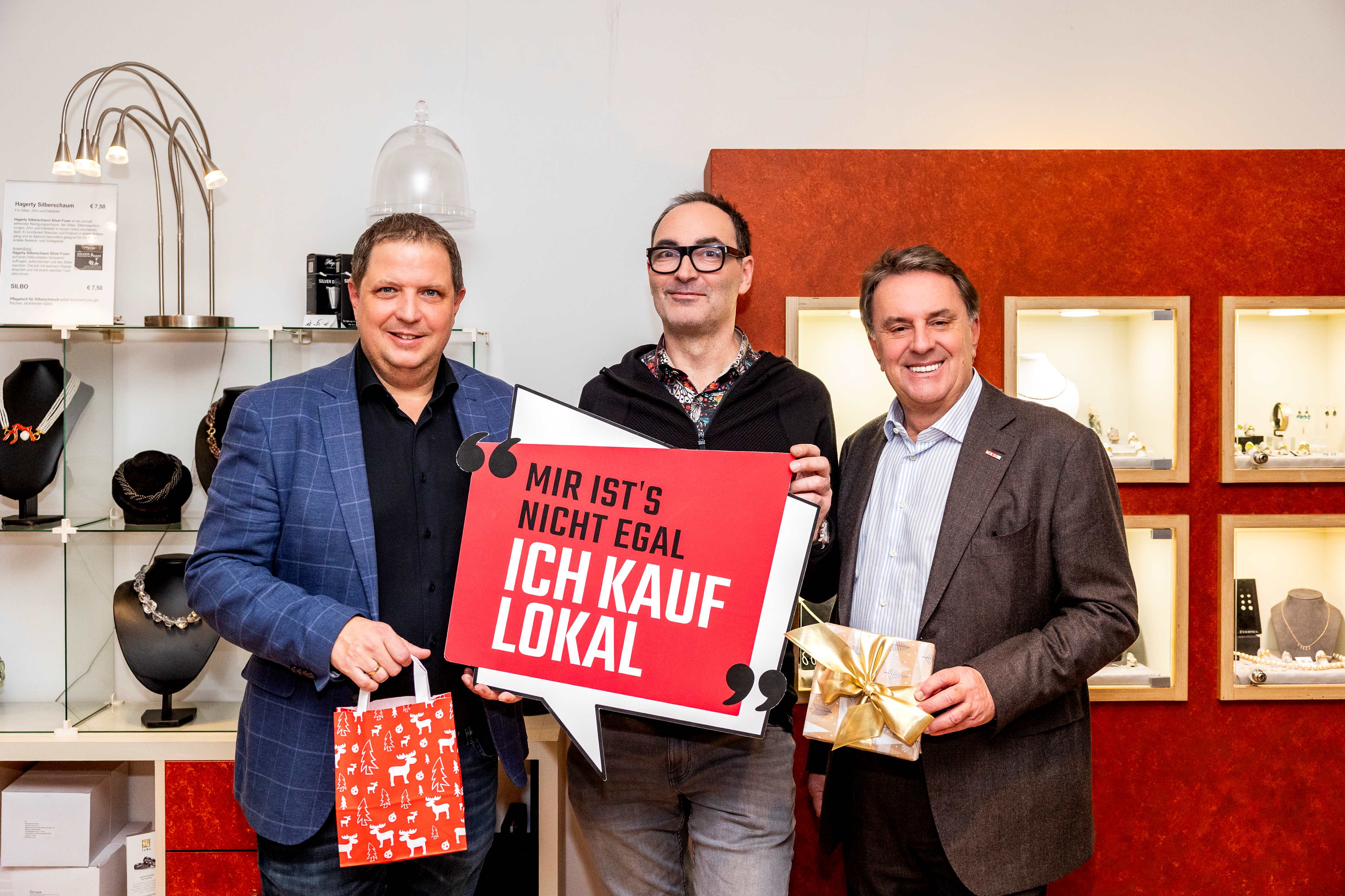 Wolfgang Ecker, Präsident der Wirtschaftskammer NÖ (WKNÖ), und St. Pöltens Bezirksstellenobmann Mario Burger zu Gast bei einem Traditionsbetrieb der Regionalitätskampagne #ichkauflokal. Er sagt: "Lokale Betriebe wie Goldschmied Surin stehen für Qualität, Vertrauen und lebendige Innenstädte.“