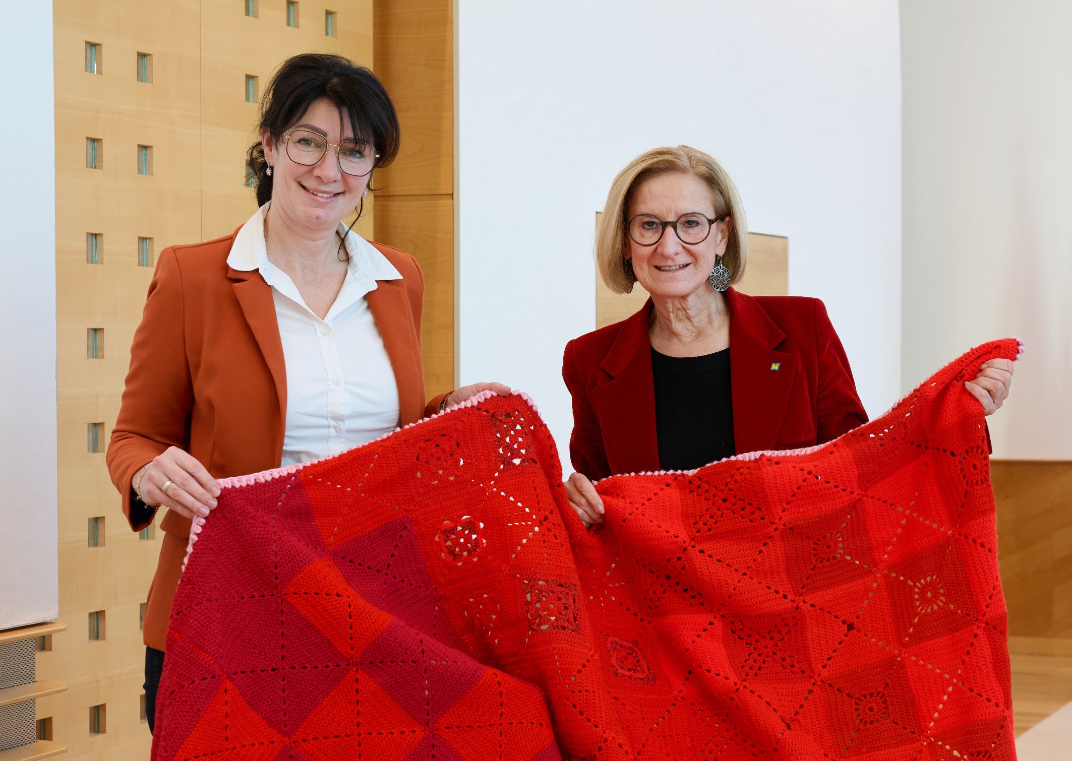 Als sichtbares Zeichen der gelebten Solidarität überreichte Nemetz-Roither der Landeshauptfrau einen roten Häkelteppich mit beeindruckenden 20 Metern Länge und zwei Metern Breite, der künftig für eine Benefizaktion eingesetzt wird.