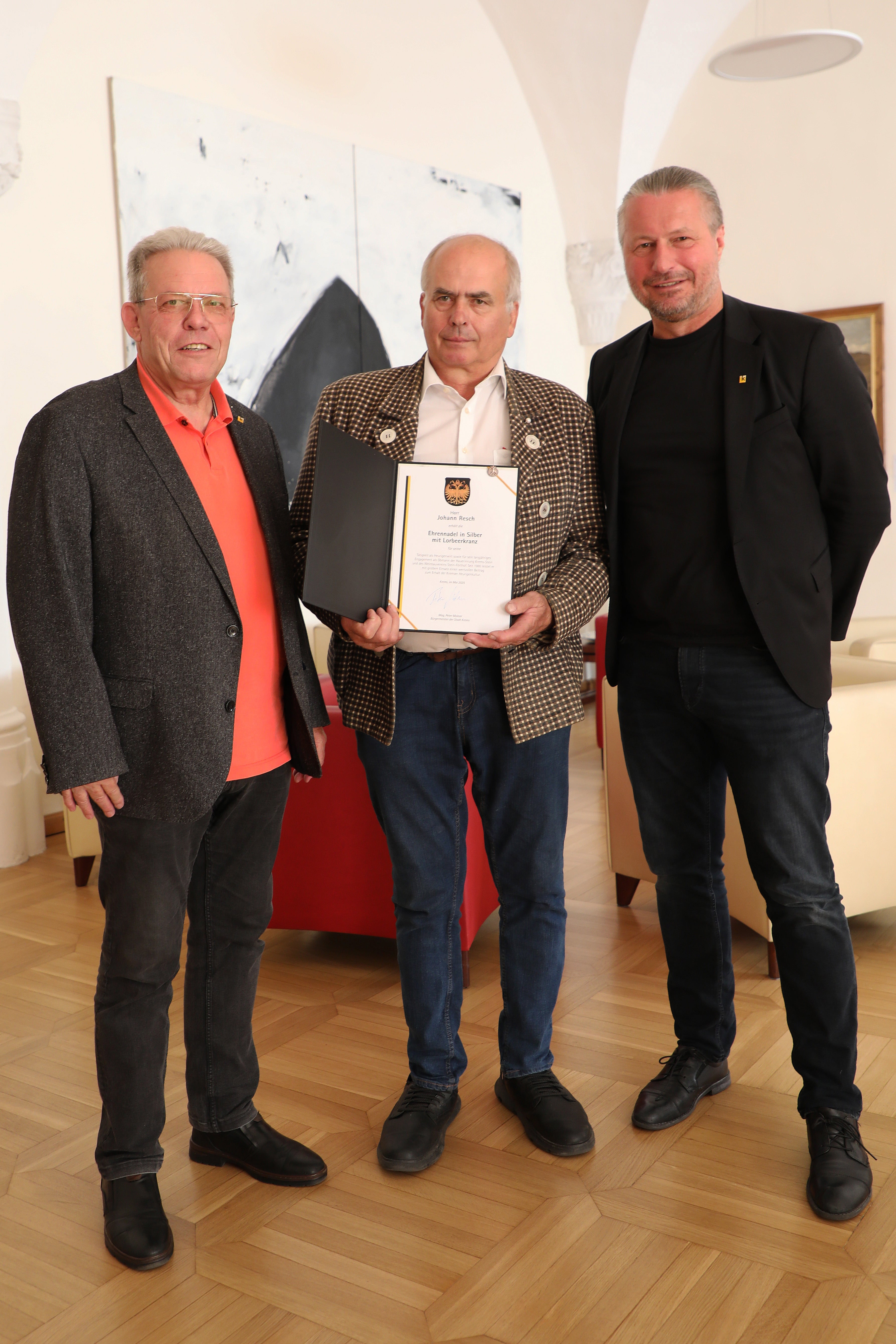 Die öffentliche Ehrung fand bereits beim Steiner Weinfest statt. Um die beiden Persönlichkeiten zusätzlich zu würdigen, lud Bürgermeister Molnar sie nochmals ins Rathaus ein. Zusammen mit GemeinderatWolfgang Mahrer empfing er Johann Resch, Josef Pichler musste leider krankheitsbedingt absagen.