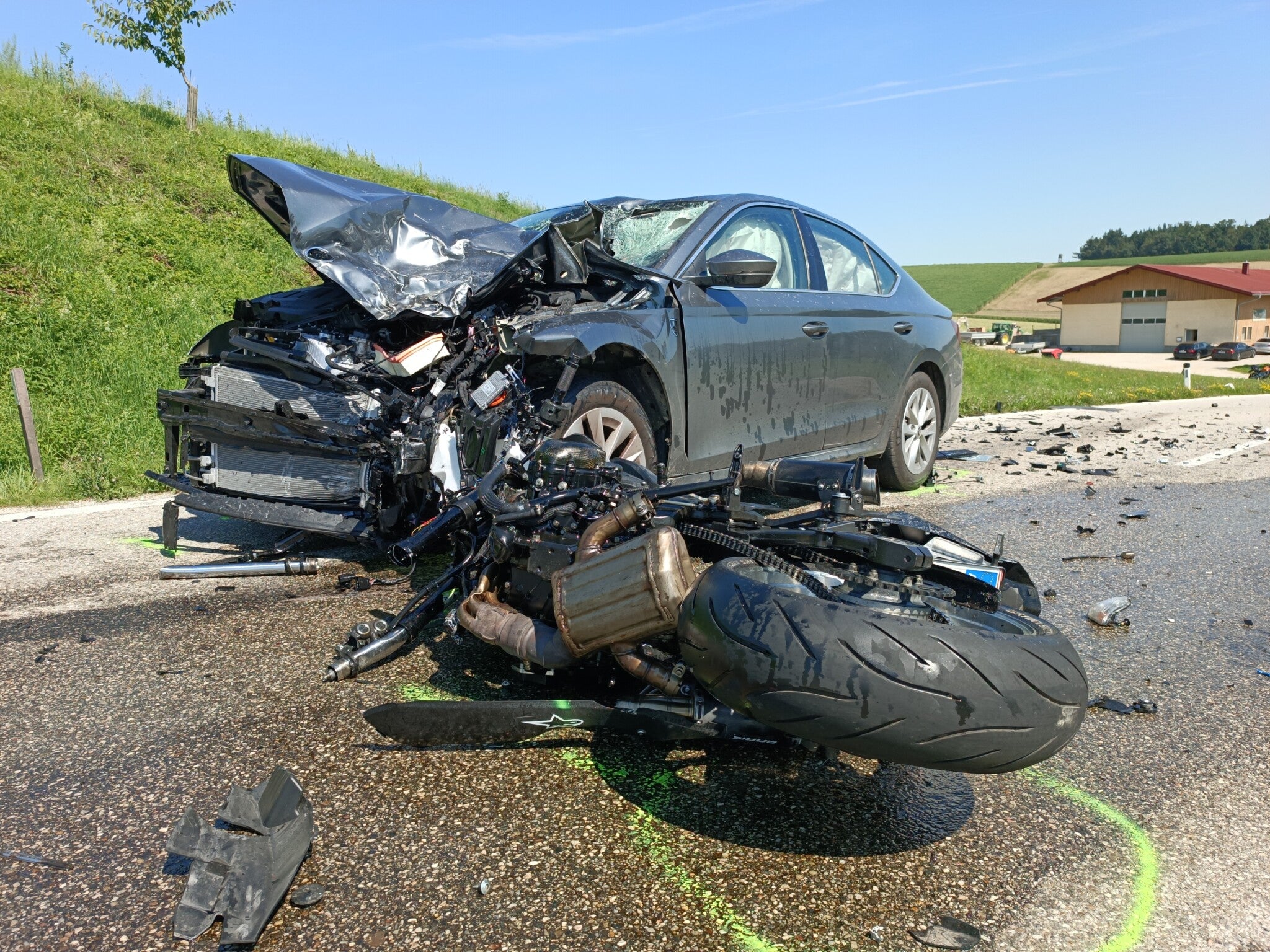 Der entgegenkommende 64-jährige Pkw-Lenker hatte keine Chance den Unfall zu verhindern, so die Polizei. Ein kurze Zeit später nachkommender Motorradfahrer der Gruppe kam dann noch wegen herumliegender Fahrzeugteile zu Sturz, er wurde mit dem Rettungshubschrauber in das UKH Linz geflogen. Der Autofahrer musste ebenfalls in ein Krankenhaus. Für den 36-Jährigen Biker kam jede Hilfe zu spät.