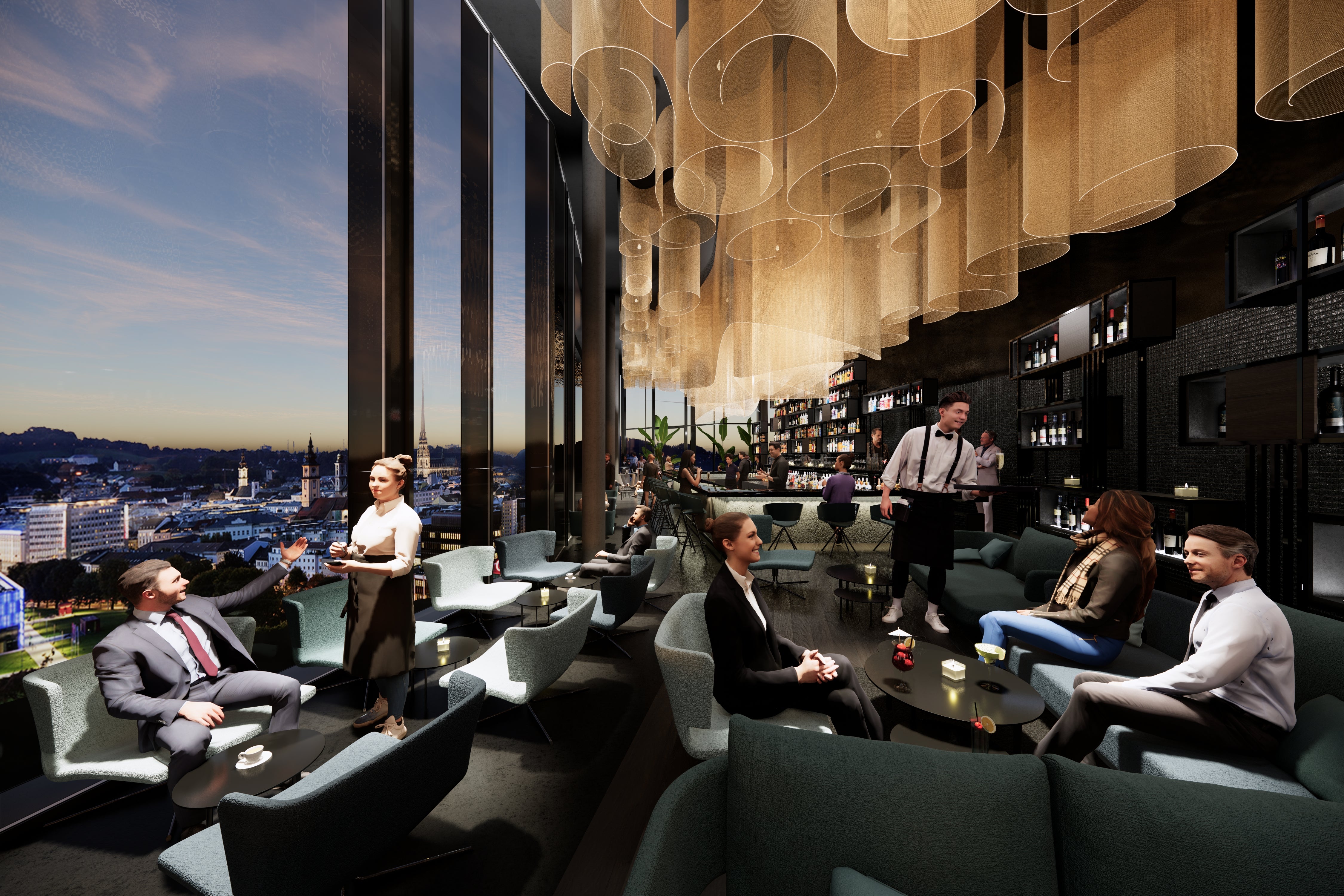Die 189 Zimmer und Suiten greifen das industrielle Erbe der Tabakfabrik gestalterisch auf. Mit rund 1.000 m² Konferenzfläche auf einer Ebene entsteht eine neue Seminardimension in der Landeshauptstadt. Wortwörtlich der kulinarische Höhepunkt ist das Q27 im 27. Stock mit Restaurant, Bar, Lounge und Sommerterrasse.