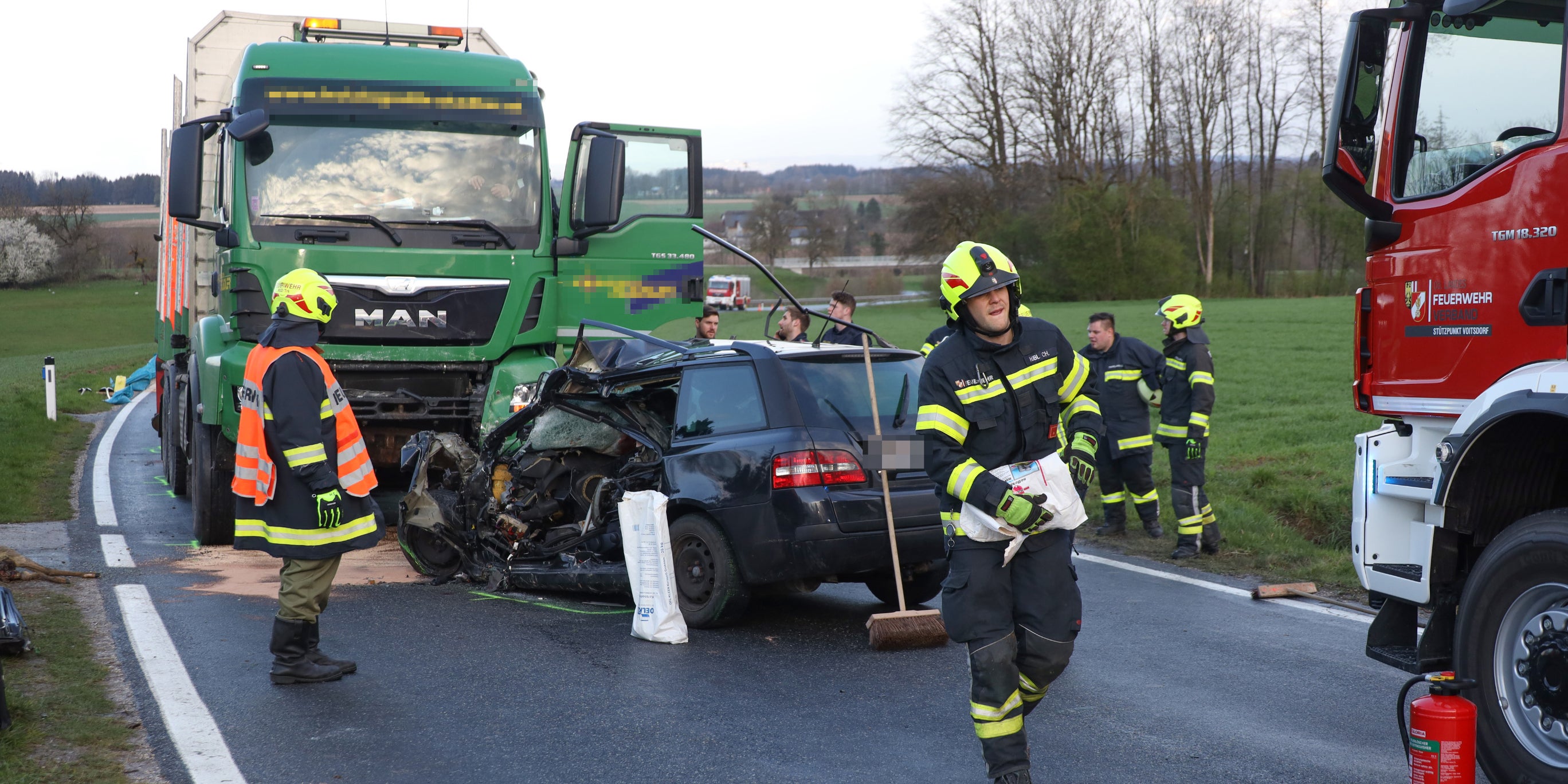 Das Auto wurde nach der Kollision mit dem Schwerfahrzeug von diesem noch 50 Meter weit mitgeschleift bis es zum Stillstand kam. Die Helfer der örtlichen Freiwilligen Feuerwehren befreiten mit hydraulischen Bergegeräten den Pkw-Lenker aus dem total demolierten Wrack. Er erlag noch am Unfallort seinen Verletzungen. Der 44-jährige Lkw-Fahrer aus dem Bezirk Wels-Land wurde verletzt ins Spital eingeliefert.