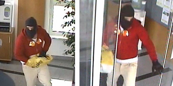 Ob der Räuber bewaffnet war, stand bis zum Nachmittag nicht fest. Der Bankmitarbeiter, der unverletzt blieb, aber einen Schock erlitt, konnte jedenfalls keine Waffe erkennen, auch auf den Videoaufzeichnungen war keine auszumachen, so die Polizei. Der Flüchtige wurde als 25 bis 30 Jahre alt, 1,70 Meter und schlank beschrieben. Er trug schwarze Handschuhe, einen roten Sweater, eine helle Hose und graue Turnschuhe.