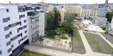 Gebäude mit Tiefgarage. Durch die Begrünung der Tiefgarage entsteht hier ein