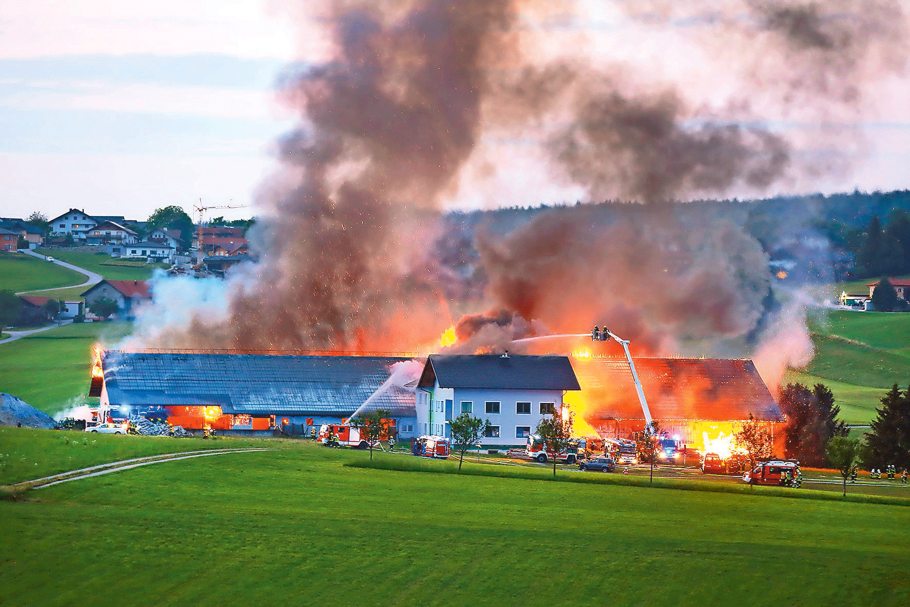 OÖ. Dramatische Szenen spielten sich am späten Sonntagabend in einem Heustadl eines Bauernhofs ab. Die Besitzer wurden kurz nach Mitternacht durch den Lärm der Rinder aus dem Schlaf gerissen. Die Feuerwehr wurde umgehend alarmiert. Rund 122 Einsatzkräfte waren vor Ort. Während sich diese auf den Weg gemacht hatten, versuchte der Sohn (21) des Hofbesitzers mit zwei Handfeuerlöschern den Brand unter Kontrolle zu bringen. Der Landwirt selbst schaffte es noch, einen Traktor aus dem brennenden Gebäude zu holen. Beim Versuch, seine Tiere zu retten, wurde der 53-Jährige verletzt, er musste zur Untersuchungs ins Spital.