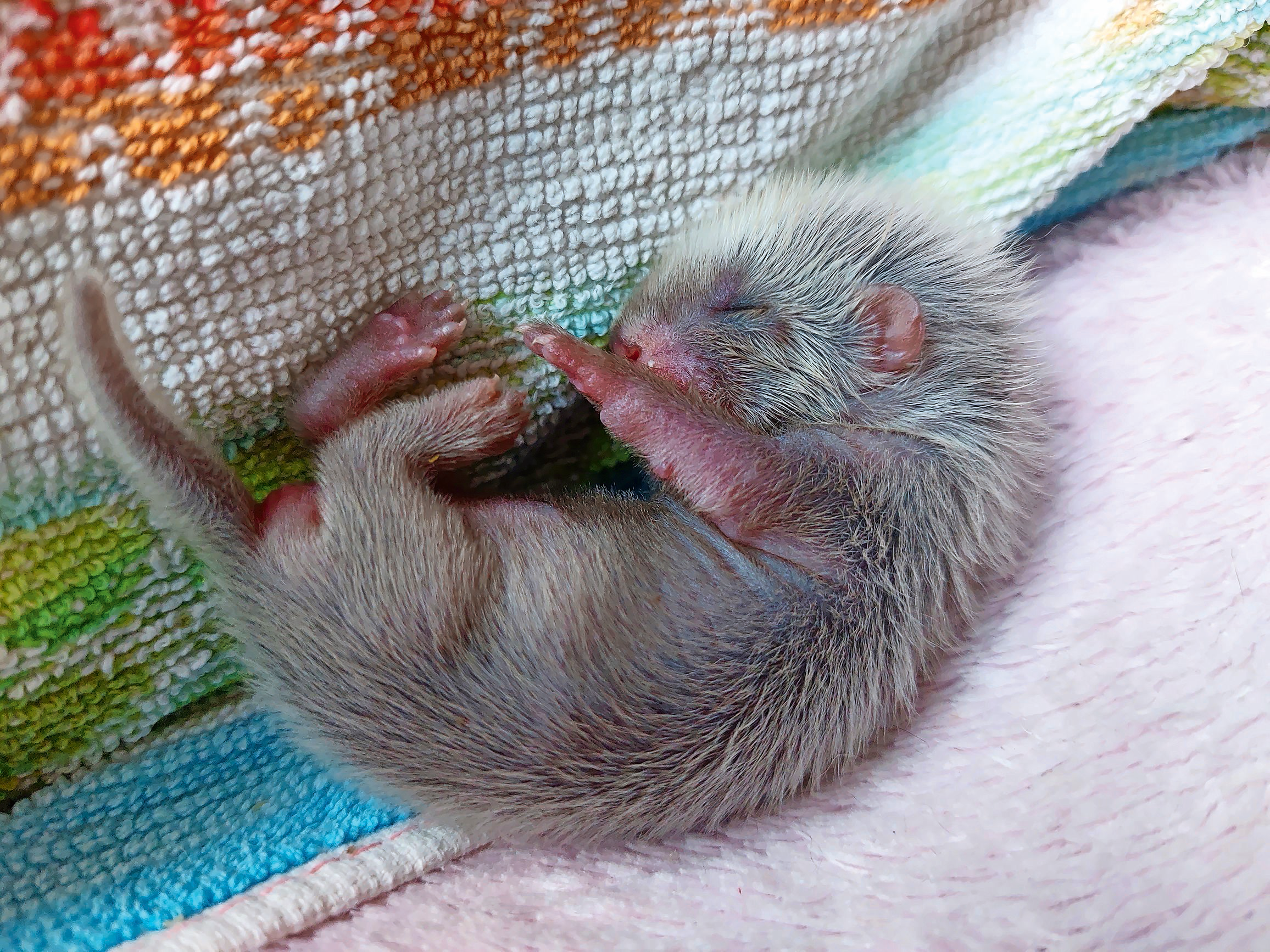 Die fehlende Nestwärme wurde mit einer Wärmeflasche und Decke ersetzt. Wenn der kleine Iltis, der eine Sie ist und vermutlich aus einem Versteck im Dachgebälk gefallen sein dürfte, im Herbst fertig aufgezogen ist, wird er ausgewildert.