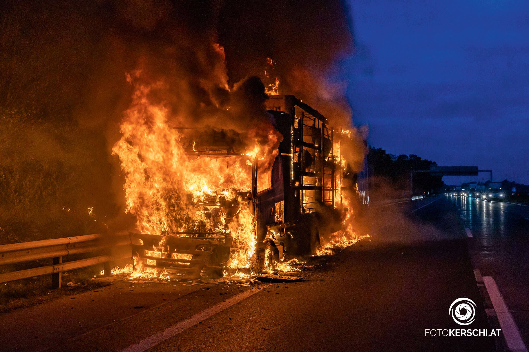 OÖ. Zu dem spektakulären Zwischenfall kam es Mittwochfrüh gegen 7 Uhr auf der A1 zwischen Enns und St. Valentin: Als ein Großaufgebot an Feuerwehren vor Ort kam, stand der mit Fahrzeugteilen beladene Sattelschlepper am Pannenstreifen bereits im Vollbrand. Der Chauffeur hatte sich wohl rechtzeitig selbst in Sicherheit bringen können, denn von Verletzten war nach Beendigung der Löscharbeiten durch die Florianis von Valentin, Haag und Amstetten kein Rede.
