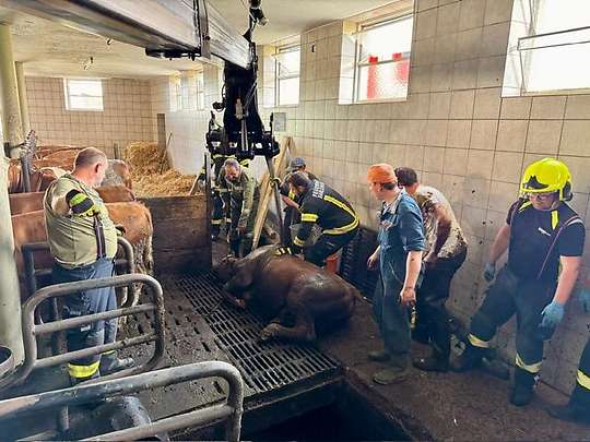 Die alarmierte Feuerwehr rückte mit mehreren Fahrzeugen und einem Teleskoplader an. Mit Gurten wurden die Tiere nacheinander angehoben und aus der Jauche befreit. Dabei konnte direkt bis zum Futtertisch im Stall vorgefahren werden. Die Jungstiere blieben bei der aufwendigen Rettung unverletzt. Nach der Bergung wurden sowohl die Tiere als auch das Gerät gründlich gereinigt. Der Einsatz war nach etwa zwei Stunden erfolgreich beendet.