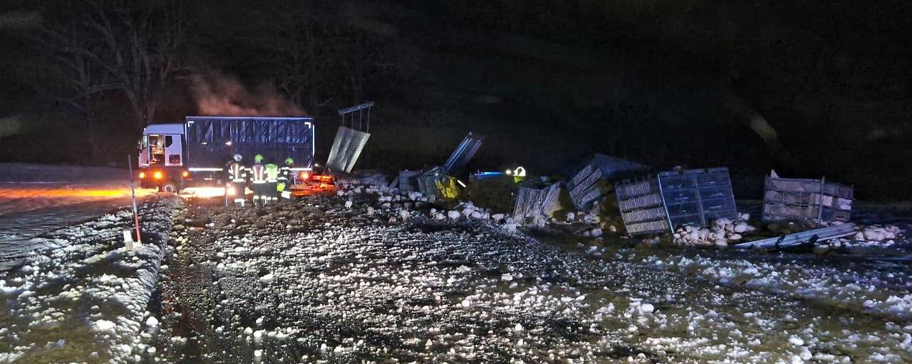 Die Feuerwehren verzeichneten seit Montagnachmittag rund 100 Einsätze, einer der spektakulärsten war ein Unfall in Frankenmarkt. Dort kam gegen 3.15 Uhr ein mit rund 2.000 Hühnern beladener Lkw auf einer abschüssigen glatten Straße ins Rutschen. Das Fahrzeug kippte seitlich in eine Wiese, dabei fielen einige Käfige vom Lastwagen. Mehrere Tiere verendeten bei dem Unfall, einige wurden verletzt. Der Großteil wurde laut Polizei auf einen anderen Lastwagen umgeladen.