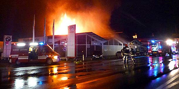Ein Großbrand in einem Autohaus im Stadtgebiet von Vöcklabruck war in der Nacht auf Dienstag zwar rasch unter Kontrolle, das Firmengebäude wurde aber teilweise ein Raub der Flammen. 138 Feuerwehrleute waren im Einsatz, die Salzkammergut Bundesstraße (B145) musste vorübergehend vollständig gesperrt werden. Das teilte die Pressestelle der Polizei Oberösterreich mit. Zwei Einsatzkräfte erlitten leichte Rauchgasvergiftungen, mehrere Wagen wurden zerstört.