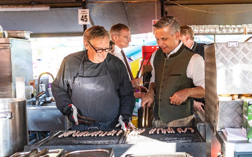 Zum vierten Mal lud Wirtschaftsminister Wolfgang Hattmannsdorfer zum „Würstegrillen für den guten Zweck“ – erstmals in seiner neuen Funktion als Bundesminister auf den Urfahraner Frühjahrsmarkt. Zwei Stunden lang stand er persönlich am Bärengrill und servierte Würste für Spenden.