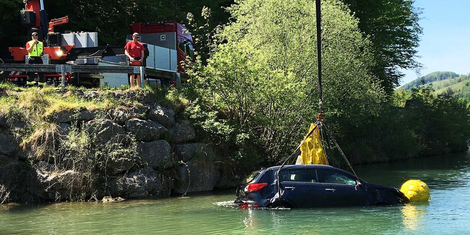 Als die Einsatzkräfte kurz vor neun Uhr verständigt wurden, war unklar, wo genau der Pkw ins Wasser gefallen war. Nachdem das etwa zwei Tonnen schwere Gefährt schließlich geortet war, wurde es mit Hebeballons an die Oberfläche gebracht, mit einem Boot rund 200 Meter flussaufwärts geschleppt und mit einem Kran an Land gehoben.
