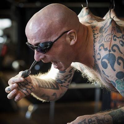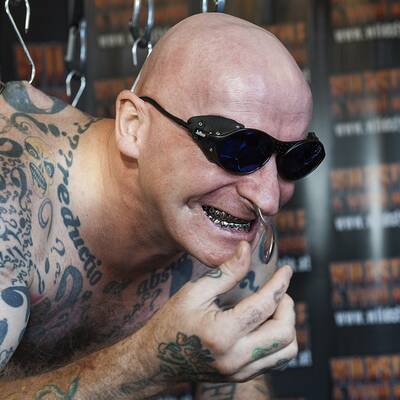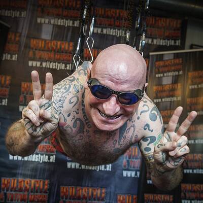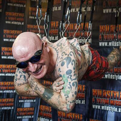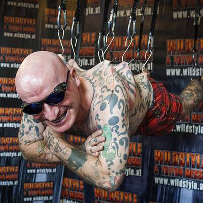Sieben Stunden und 51 Sekunden hat der gebürtige Schotte John Kamikaze beim "Day of Freakshow World Records 2014" am Freitag in Bad Ischl an acht Haken hängend verbracht und damit einen Weltrekord aufgestellt. Zusätzlich knackte er weitere Bestmarken im Löffel-in-die-Nase-Stecken. Er überstand die Prozeduren wohlbehalten und freudestrahlend.