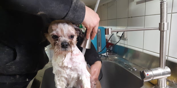 Nachdem der Notruf des nahen Tierschutzhofs Pfotenhilfe gerufen wurde, konnte der arme Kerl dort hingebracht und gleich von der entsetzten Geschäftsführerin Johanna Stadler versorgt werden: „An den Zähnen sieht man, dass der Hund erst ein bis zwei Jahre alt ist. Die total verfilzten Fellberge waren so üppig und schwer, dass ich ihn zuerst scheren musste, um überhaupt zu erkennen, dass es sich um einen unkastrierten Rüden der Rasse Shitsu handelt. Danach habe ich ihn noch gebadet und der Kleine war nicht wiederzuerkennen. Es ist schockierend und nicht nachvollziehbar, wie man ein Tier so vernachlässigen kann, dass es so aussieht! Er war voller Kot und Urin und muss daher mindestens monatelang inmitten seiner eigenen Fäkalien eingesperrt oder angekettet gewesen sein.“