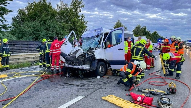 OÖ. Ein Kleinbus mit neun Syrern ist auf der A8 bei Sattledt (Wels-Land) verunglückt. Die Passagiere zwischen 13 und 44 Jahren wurden verletzt, der Chauffeur schwer. Er war auf dem Fahrersitz eingeklemmt und konnte nur durch die Windschutzscheibe befreit werden. Der 53-Jährige wurde ins Klinikum Wels eingeliefert. Am Voralpenkreuz kam der Bus wegen zu hohen Tempos von der Fahrbahn ab, kollidierte mit einer Betonwand und blieb auf der Fahrerseite liegen. Ersthelfer hielten den Kleinbus an der Dachkante fest, um ein Kippen zu verhindern. Der schwer verletzte Lenker konnte durch die herausgeschnittene Windschutzscheibe geborgen werden.