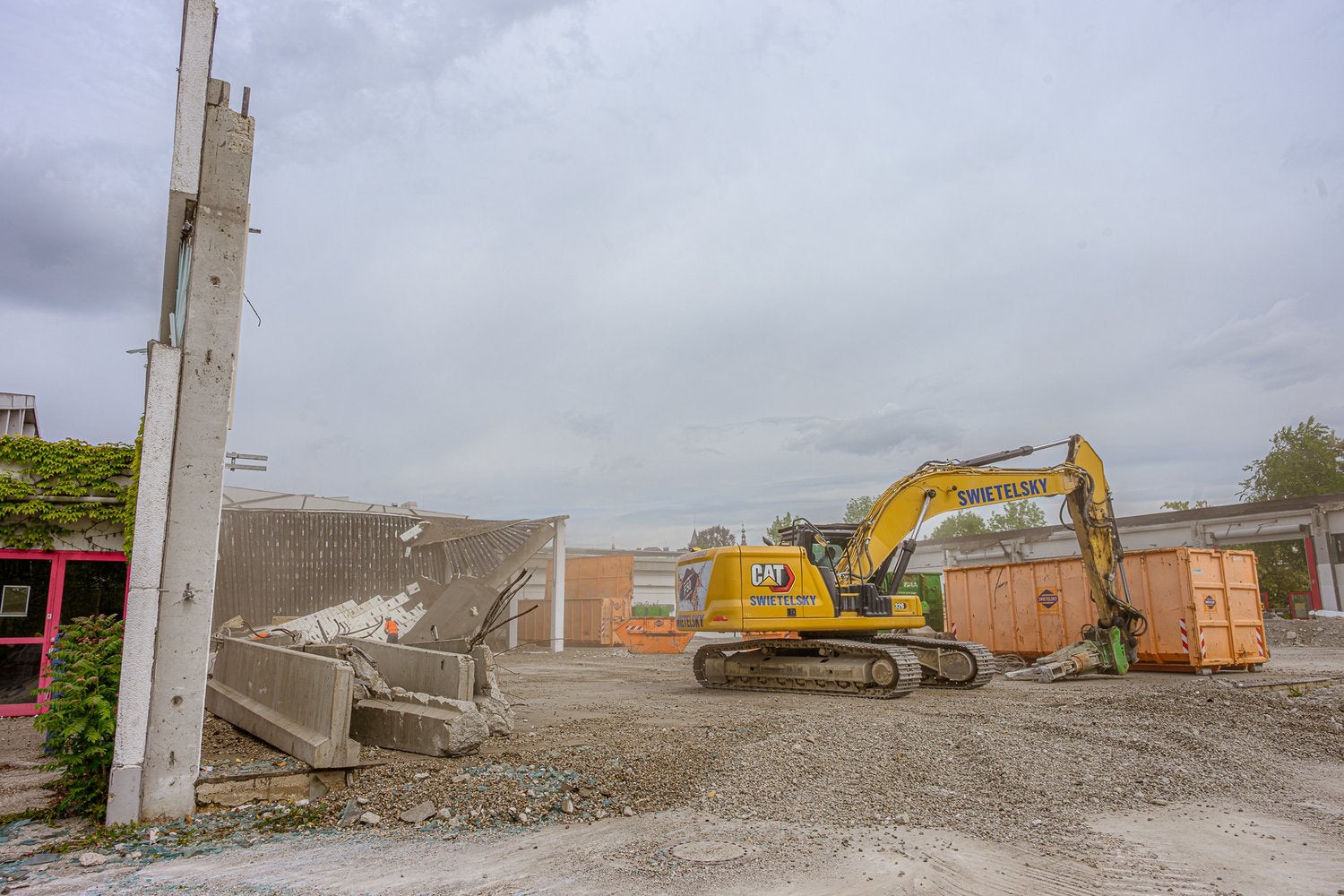 Seit Ende April laufen die Abbrucharbeiten für das Großprojekt „Volksgarten Neu“ in Wels planmäßig. Die alten Messehallen werden schrittweise entfernt, bis Juli folgen weitere Abschnitte.