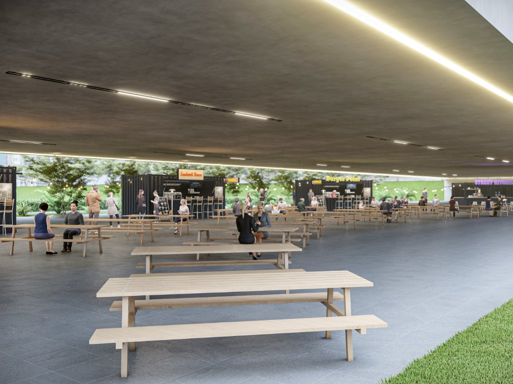 Das „under the bridge“-Areal besteht aus mehreren Einzelcontainern und bildet das Herzstück der neuen Gemeinschaftszone. Neben Gastronomie unter dem schützenden „Dach“ der Brücke bietet es Liegestühle, Partyutensilien zum Ausleihen und vielseitige Spielmöglichkeiten wie Boccia, Mini-Tischtennis und Cornhole. Das Konzept verzichtet bewusst auf Konsumzwang, sodass die Infrastruktur allen offensteht. Mobile Stadtmöbel könnten als zusätzliche Sitzgelegenheiten dienen.