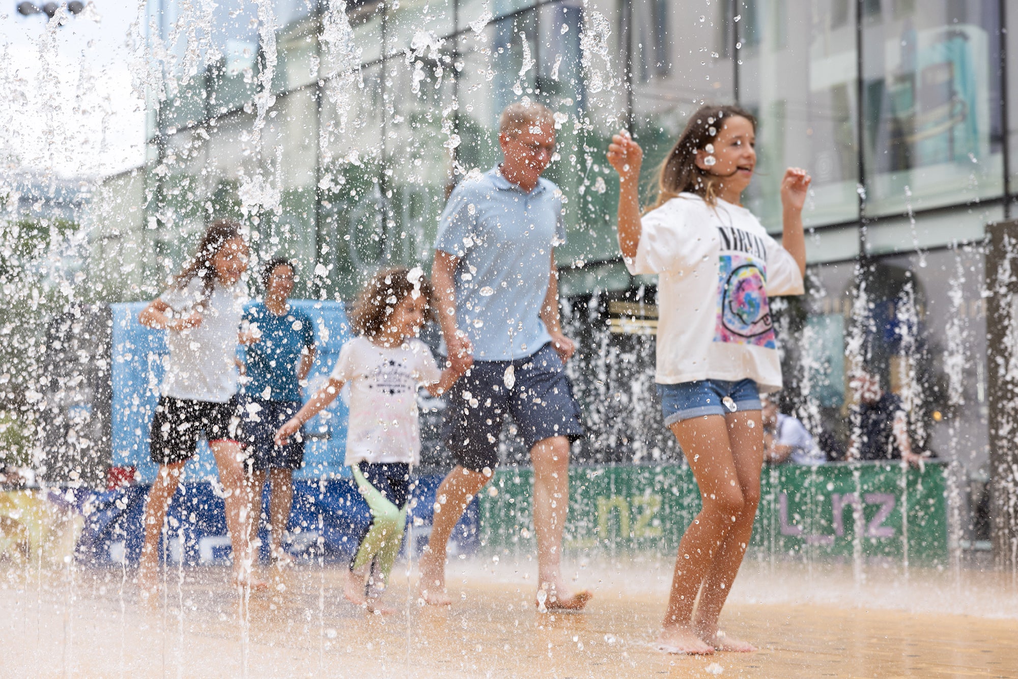 Tagsüber laden 19 Wasserspiele zum Mitmachen ein, abends faszinieren sieben Shows mit Licht und Musik. Der rutschfeste Boden, mobile Sitzgelegenheiten (Dwellos) und Begrünungen machen den Platz zum beliebten Treffpunkt für alle Generationen. Dank Wasseraufbereitung und Energiespeichersystem ist die Attraktion zudem nachhaltig. Das Gemeinschaftsprojekt von Stadt Linz, Linz AG und Tourismusverband stärkt Handel, Tourismus und das soziale Miteinander in der Innenstadt.