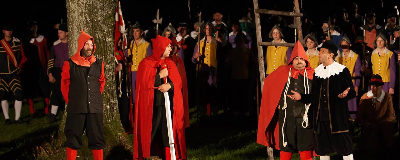 Frankenburg. 2025 jähren sich zwei bedeutende Ereignisse: Vor 400 Jahren fand das Blutgericht von Frankenburg statt, vor 100 Jahren wurde es erstmals als Volksschauspiel aufgeführt. Über 500 Laiendarsteller*innen erwecken heuer erneut das historische Geschehen auf der Freilichtbühne in Leitrachstätten zum Leben. Das grausame Würfeln um Leben und Tod im Jahr 1625 markierte den Beginn der oberösterreichischen Bauernkriege.
