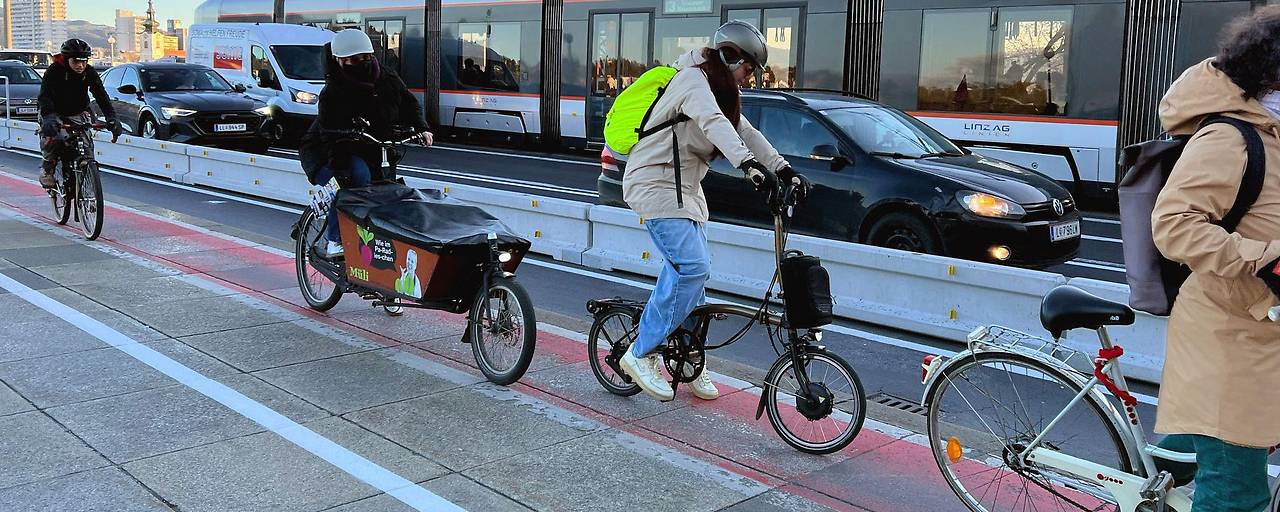 Seit Montag ist auf der Linzer Nibelungenbrücke der neue Radstreifen in Betrieb. Für mehr Sicherheit für Radfahrende wurde ein Fahrstreifen für den Autoverkehr gestrichen.